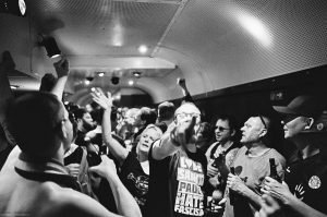 Im Sonderzug gibt es zwei Partywagen, in denen jeweils eine Tresencrew und jeweils ein DJ dafür sorgen, dass während der kompletten Fahrt gute Laune, frische Getränke und die Möglichkeit das Tanzbein zu schwingen, vorherrscht. Unnötig zu erwähnen, dass alle ehrenamtlich arbeiten und die Erlöse des Getränkeverkaufs sozialen Projekten zugute kommen. Die Crews hinter Tresen und Plattenteller wechseln natürlich und so wabern unterschiedlichste Musikrichtungen während der Fahrt durch den kompletten Zug. Denn die Ideen der DJs von Musik können über die normalen Lautsprecher in den Abteilen abonniert werden. Machen – glaube ich – alle. Gefühlt startet das bei Deathmetal und endet bei Schlager. Für jeden Menschen mit zwei gesunden Ohren durchaus eine Herausforderung, aber meine Freejazz Wünsche werden nie von den DJs aufgenommen. Verstehe ich gar nicht. So lerne ich dann tolle Gassenhauer kennen, wie zum Beispiel Karl Dalls „Heute schütte ich mich zu“. Oder Mike Krüger mit seiner Ode an den Bundeswehrsoldaten. Ich hatte meiner Frau kleine Videosequenzen mit dem Handy aufgenommen, denn sonst glaubt sie mir ja nicht, welche Songs Hardcore Sankt Pauli Fans mitgröhlen können. Es gibt natürlich auch schicke Lieder, die ich mir hinterher noch gerne anhöre. Gebe ich gerne zu. Diesmal war Eight Balls mit „Individuell“ sehr beliebt. Kann man bedenkenlos mitgröhlen. Niveau ist eben doch eine Handcremé.