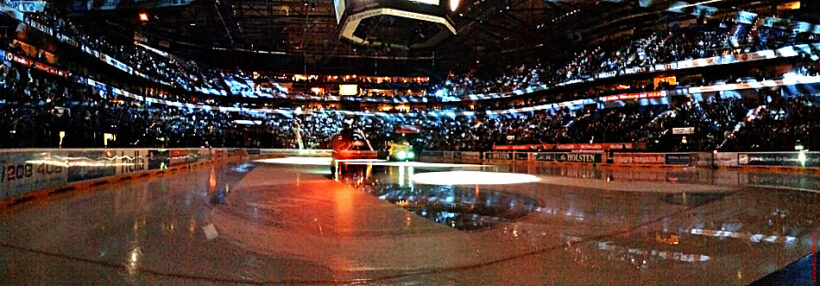 Hier mal ein Panorama aus 7 Einzelbilder von der sehr dunklen Color Line Arena, fotografiert kurz vor Beginn eines Eishockeyspiels: