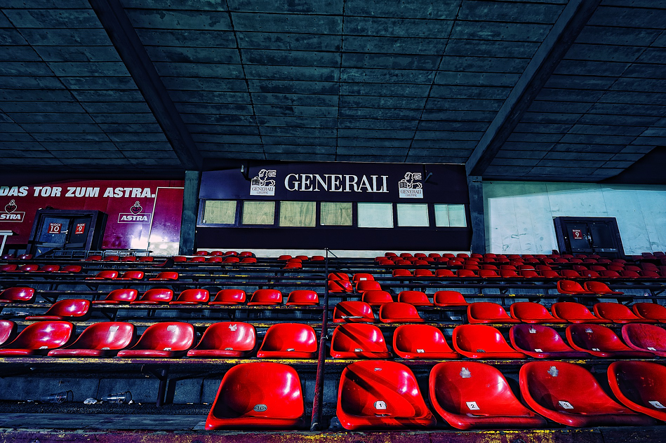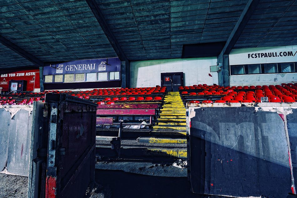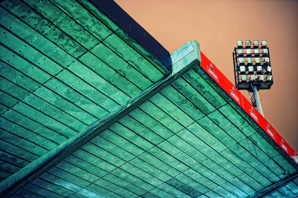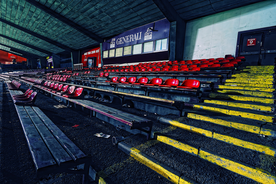 Ich habe um kurz vor acht Uhr abends eine der letzten Gelegenheiten genutzt, diese Haupttribüne fotografisch zu erfassen.