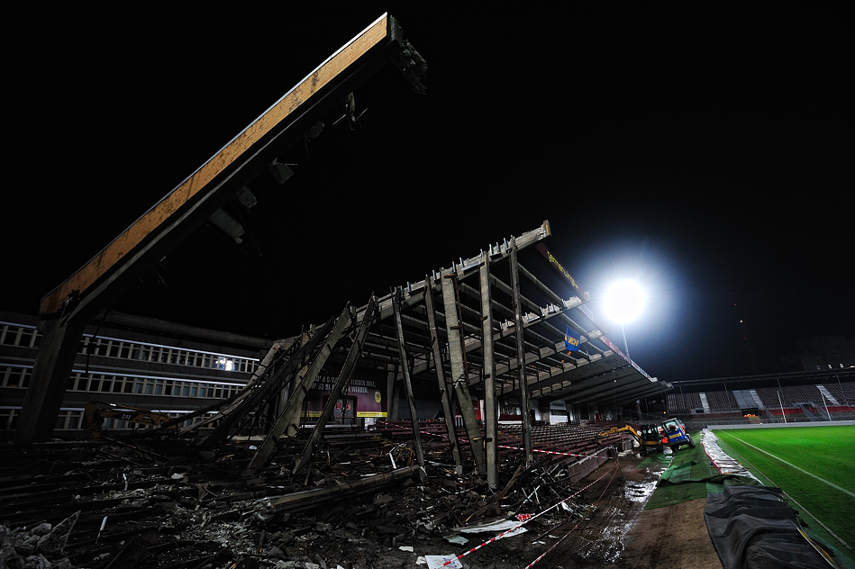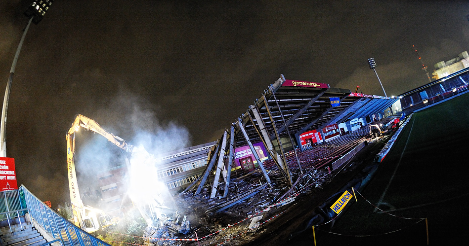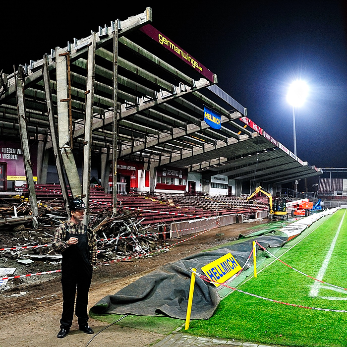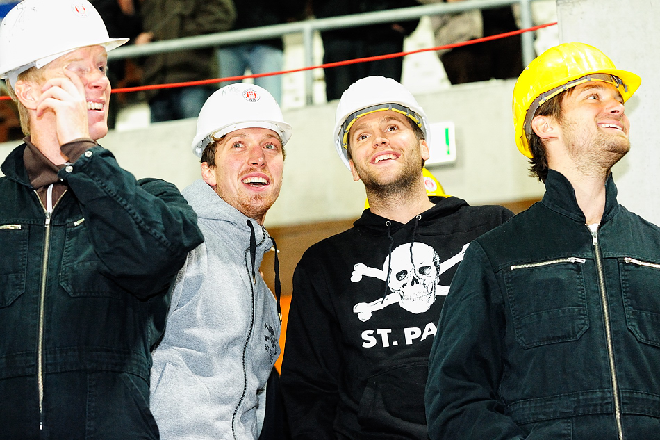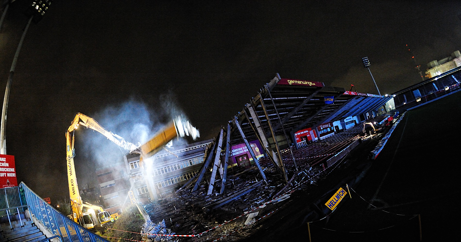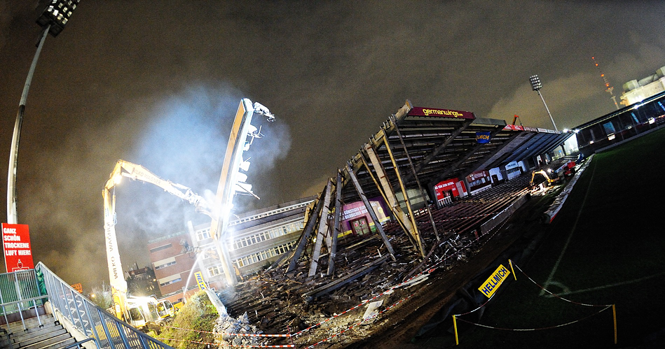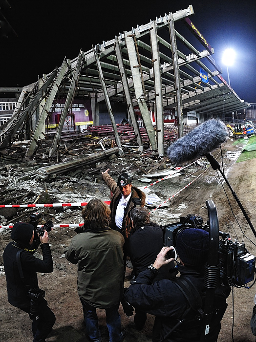 Es spricht aber auch für den Medienstandort Hamburg, wenn der Einsturz eines Stützpfeilers vom Dach der Haupttribüne live im Fernsehen gezeigt wird und mehrere Fernsehkamerateams, sowie ca ein Dutzend Fotografen anwesend sind. Allerdings haben auch ca 3000 Fans den Weg ins kalte Millerntor gefunden…