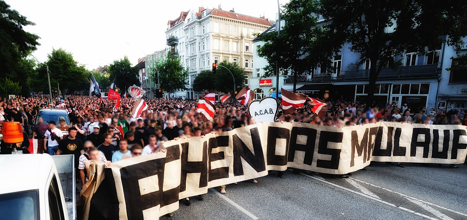 Nach dem Spiel gab es dann noch die zweite Demo gegen Polizeigewalt. Grund der Demo sind die ungeheurlichen Vorfälle Anfang Juli – und natürlich auch der Schlingerkurs von Hamburgs Innensenator Ahlhaus (CDU), der im Nachgang der Übergriffe durch Polizisten täglich andere fadenscheinige Erklärungen abgegeben hat. An der Demo haben übrigens auch HSV Fans teilgenommen.