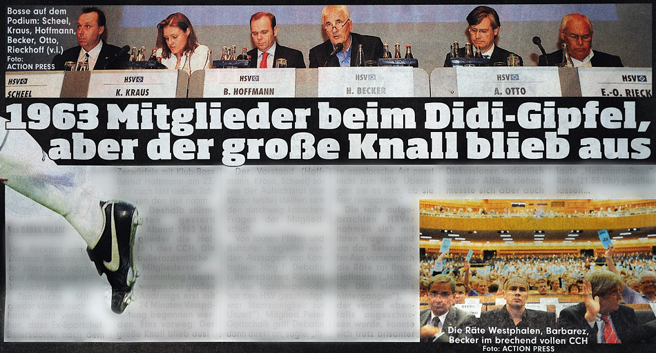 Um Bilder verkaufen zu können, musste ich also einfach schneller als die anderen sein. Um 19 Uhr begann die Versammlung offiziell und wegen des starken Mitgliederandrangs wurde die Begrüßung um 25 Minuten nach hinten verschoben. Schon um 18:58 Uhr habe ich die ersten Bilder von den Personen mit besonderem Interesse für die Zeitungen an meine Agentur weitergegeben – Aufsichtsratschef Horst Becker und Vorstandschef Bernd Hoffmann. Etliche Telefonate mit meinem Chef am Agenturserver später war die turbulente Versammlung beendet.