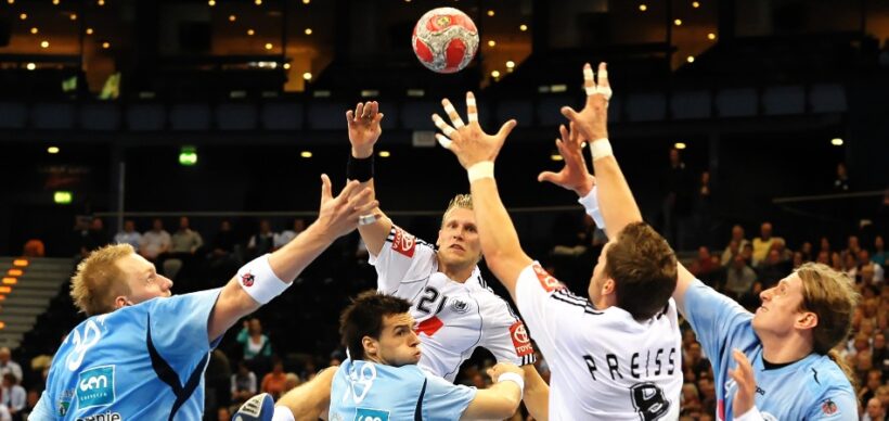 Zu sehen ist ein Pass von Lars Kaufmann auf Sebastian Preiss von der deutschen Handball Nationalmannschaft, der die slowenische Abwehr von Miha Zvizej, Klemen Cehte und David Miklavcic aushebelt. Die Bildfolge entstand am 13. Juni 2009 in Hamburg beim 38:30 vom DHB gegen Slowenien im EM-Qualifikationsspiel.
