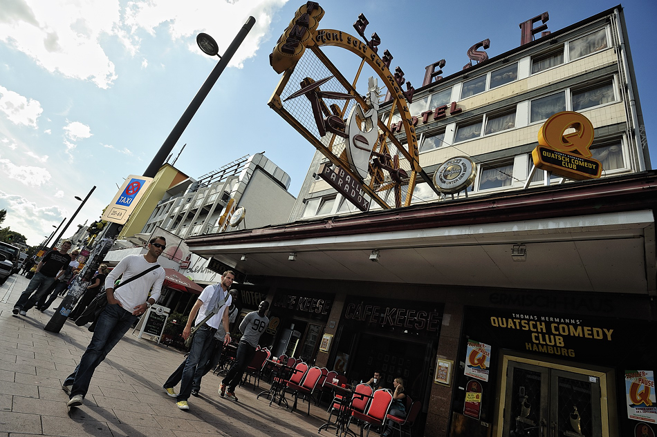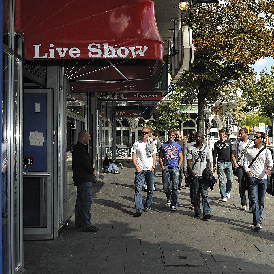 Die Kurverwaltung Sankt Pauli führte die Mannschaft mit unterschiedlichen Schwerpunkten in drei Gruppen durch das Viertel. Aus nachvollziehbaren Gründen war die Stimmung unter den Spielern nach dem sehr schweren Sturz eines Sankt Pauli Fans im neuen Aachener Tivoli nach dem Sieg vom Vorabend sehr gedrückt. Immerhin hatten viele Spieler den Sturz mit eigenen Augen gesehen. (Hier möchte ich gerade als Fotograf mal erwähnen, dass sich der „Kollege“, der den Auslöser beim Anblick eines Menschen, der gerade mehrere Meter tief auf Beton gefallen ist, gedrückt hat und nichts besseres zu tun hatte als das Bild auch noch zur Veröffentlichung frei zu geben, doch mal bitte fragen soll, ob er den Begriff „Ethik“ kennt. Es gibt viele Wege dramatische Ereignisse ins Bild zu setzen. Einen lebensgefährlich verletzten Menschen zu zeigen ist die einfachste Art – von einem langjährigen Profi erwarte ich deutlich mehr Einfallsreichtum und Sensibilität.)