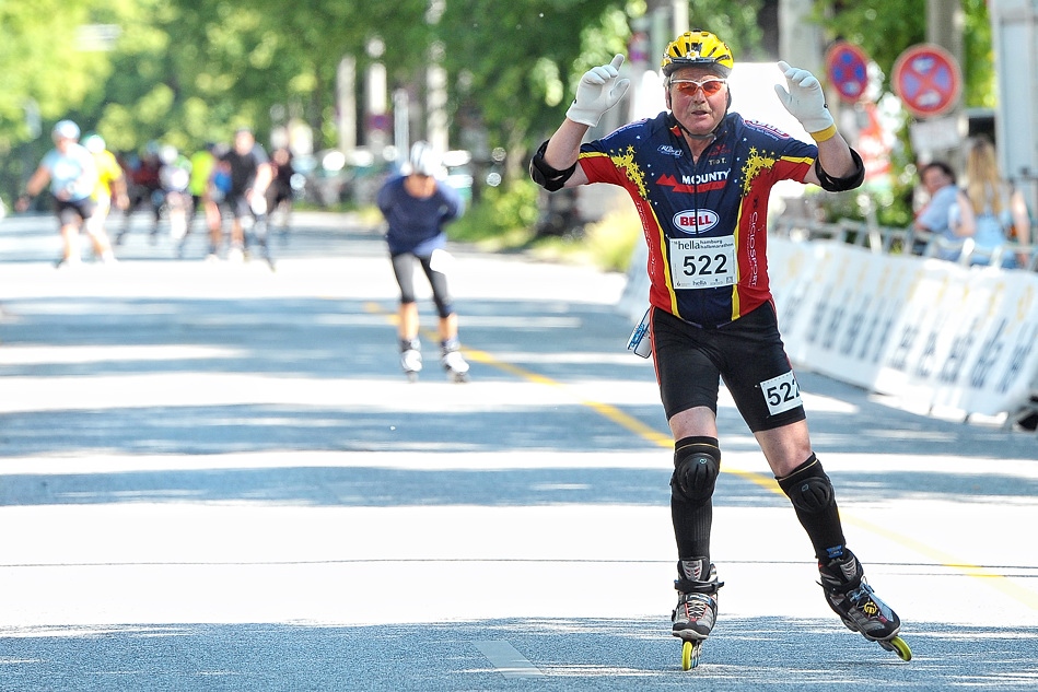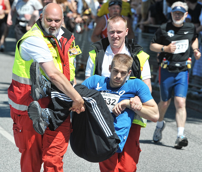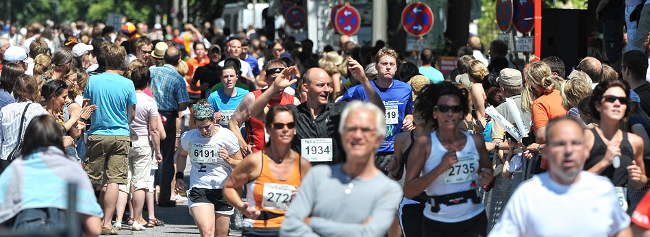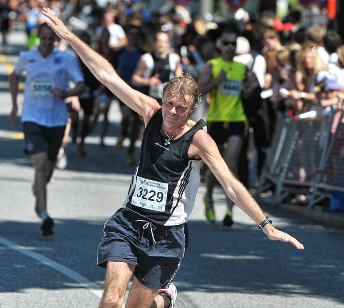 Außerdem war meine Kameraposition eine andere. Normalerweise fotografiere ich leicht von unten, damit die Aktionen der Sportler besser aussehen. Bei dieser Veranstaltung kommt es aber darauf an, möglichst alle fotografisch festzuhalten. Das funktioniert bei der Masse an Teilnehmern nicht, wenn ich mit einem tiefen Kamerastandpunkt fotografiere. Fast 6000 Leute sind innerhalb von vier Stunden ins Ziel gekommen. Einzelporträts waren da nur sehr selten möglich. Ich habe mich also auf eine Leiter leicht erhöht gestellt, denn das vergrößert die Chance zumindest die Gesichter der Teilnehmer abzulichten.