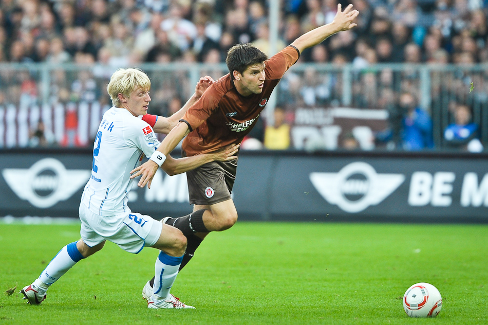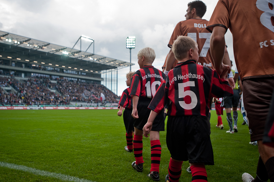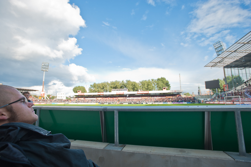 Größtes Ärgernis der neuen Haupttribüne sind übrigens die Behindertenplätze. Im Bild 2 meiner Galerie vom Spieltag könnt ihr sehen, wie wenig Rollstuhlfahrer vom Spielfeld sehen. Die Betreuerplätze sehen im Sitzen übrigens noch weniger. Glücklicherweise stören sie niemanden, wenn sie stehen. Allerdings gibt es auch unter den Betreuern gehbehinderte, die nicht 90 Minuten stehen können. Ich habe mir von einigen Anwesenden erzählen lassen, dass die Balustrade wohl kurzfristig um einige (entscheidende) Zentimeter gegenüber der ursprünglichen Planung erhöht wurde. Nun gut, das Dilemma ist heilbar, aber der Verein sollte schnell nachbessern.