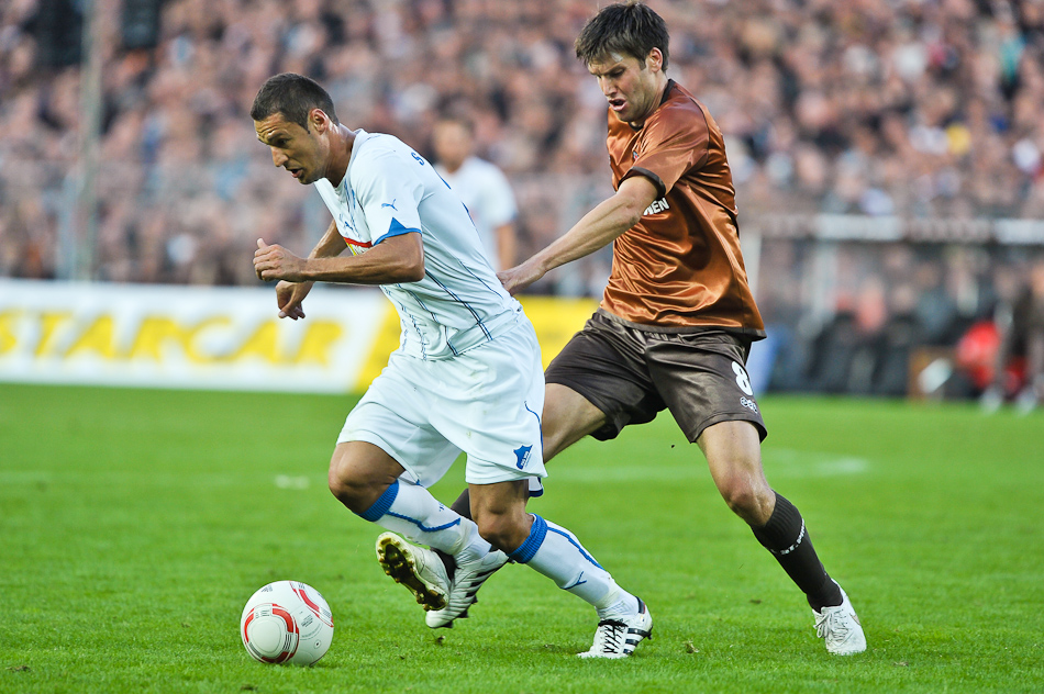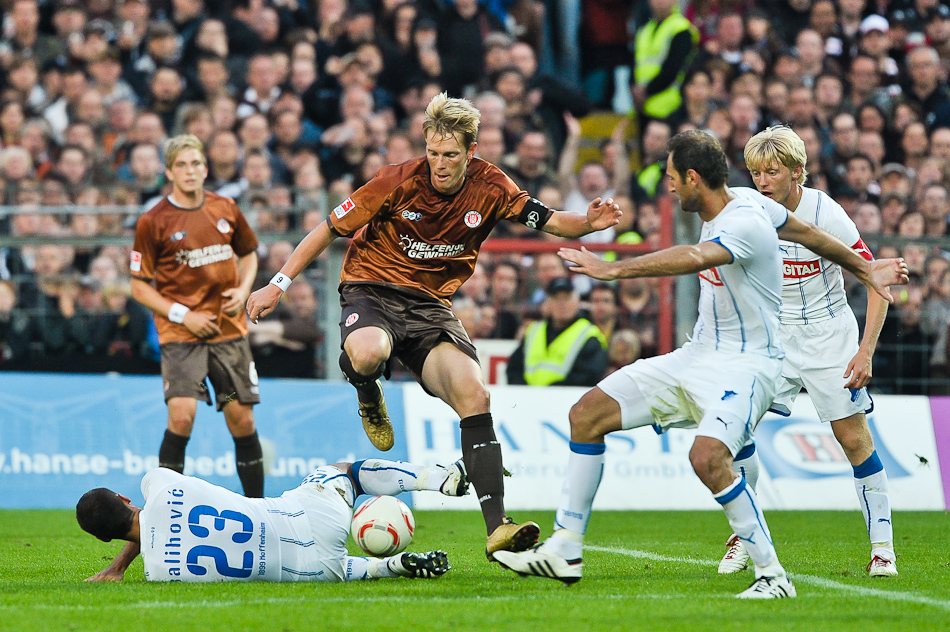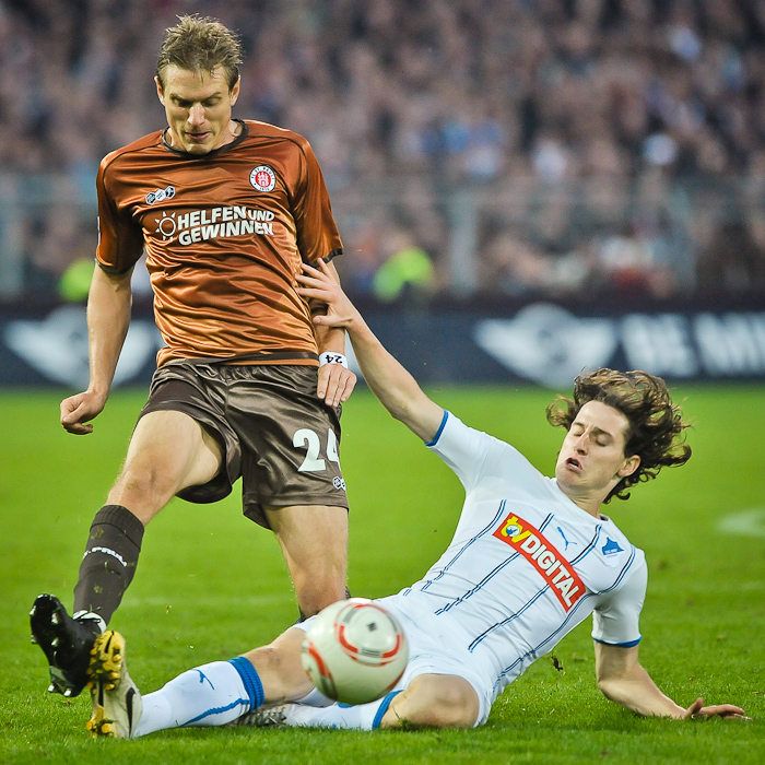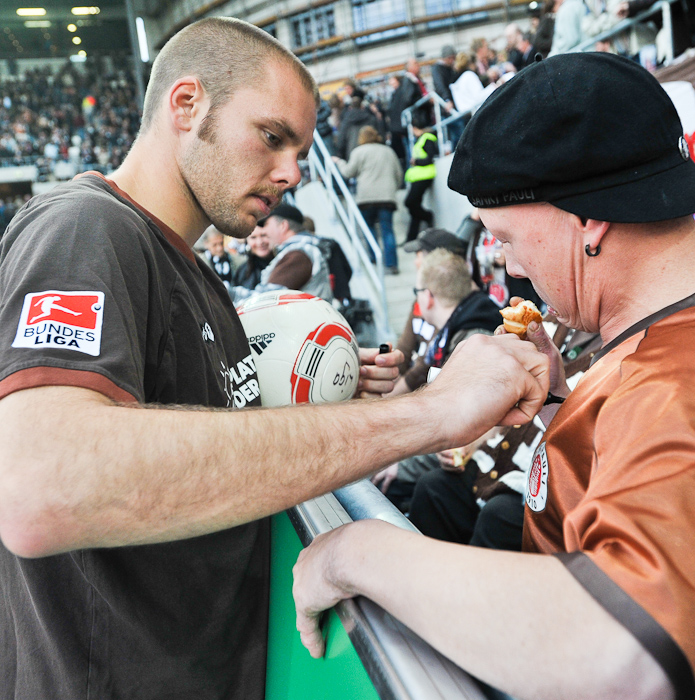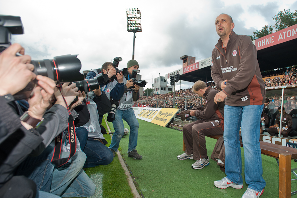 Die Fotografen arbeiten nun vor der neuen Haupttribüne und nicht mehr auf der Seite der Trainerbänke. Das hat den Nachteil, dass ich mich irgendwie weiter weg vom Spielgeschehen fühle. Früher konnte ich oft noch die Trainer Anweisungen rufen hören. Der Vorteil ist, dass nun mehr Platz vorhanden ist und ich nun auf einer ebenen Fläche sitzen kann. Früher viel mein Hocker immer um, wenn ich aufgestanden bin. Außerdem werde ich nach einem heftigen Regenschauer nicht mehr im Matsch sitzen. Allerdings sitze ich immer noch im Regen, wenn es regnet. Der erste Meter, der vor der neuen Haupttribüne nass wird, ist der Meter in dem die Fotografen sitzen.