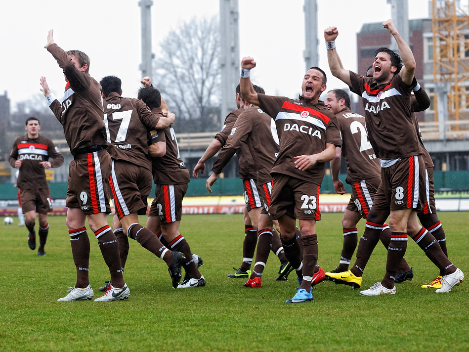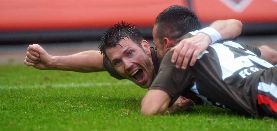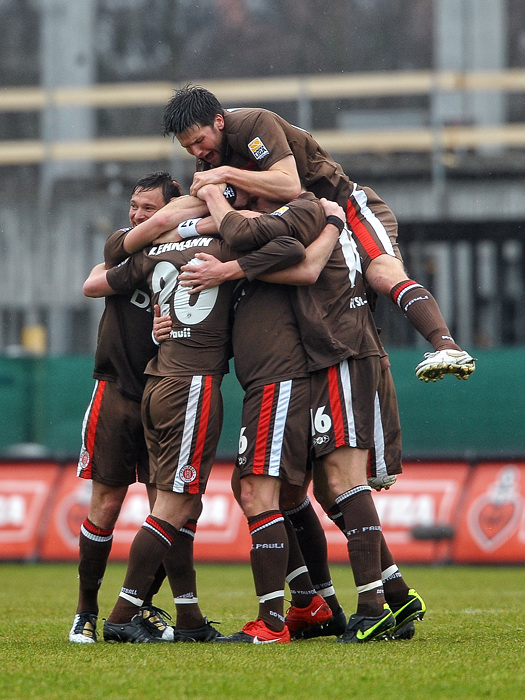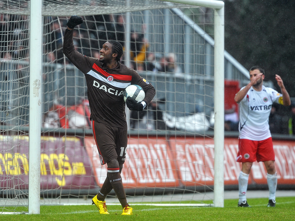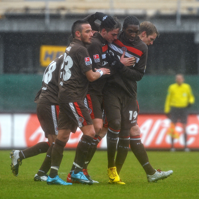 Aber was da gestern beim Spiel Sankt Pauli gegen Oberhausen von oben kam war in der Verbindung mit dem von vorne kommenden Wind das schlimmste, was ich bisher erlebt habe. In der ersten Halbzeit ging es noch einigermaßen, aber in der zweiten war dann alles nass. Glücklicherweise hatte ich mehrere Tücher dabei, um meine Frontlinse trocken zu wischen. Aber der Nachmittag verlief wirklich in dem Rythmus „wischen, drei Bilder machen, wischen, drei Bilder machen, wischen,…“