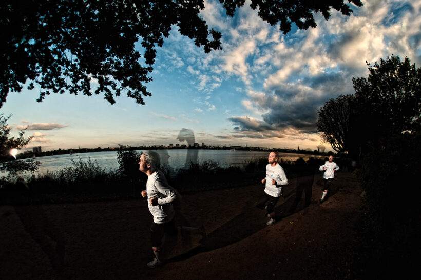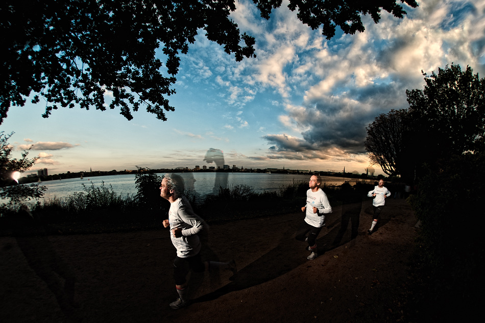 Für sein Foto wollte Norbert ein laufendes Bild. Und da ich in der Reihe „Hamburger Blogger“ gerne mal was anderes ausprobiere, ist eine Mehrfachbelichtung daraus geworden. Dieses Aufnahmeverfahren eignet sich besonders vor dunklen Hintergründen. Ich hatte die Hoffnung, dass der Helligkeitssunterschied zwischen dem im Baumschatten liegenden Vorder- und dem sonnendurchfluteten Hintergrund groß genug ist, um eine solche Aufnahme, die mehrere Belichtungen auf dem „gleichen Stück Film“ brennt, zu ermöglichen. Leider war die Sonne dann doch schon zu weit untergegangen und mein „Geist“ ist gut zu sehen. Ich finde das nicht schlimm – und Norbert auch nicht.