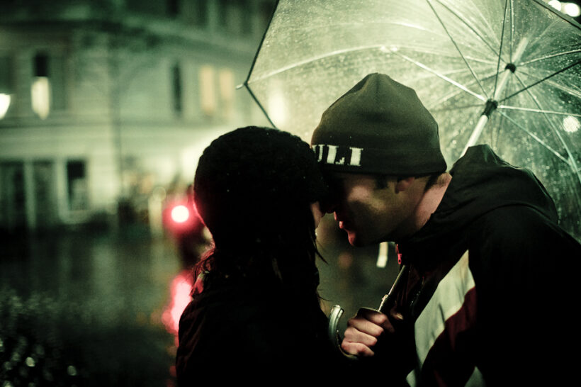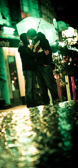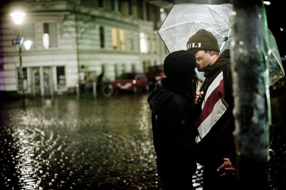 Der Plan war so einfach wie genial. Mr. Paupi und seine schöne Tanja wollten von mir fotografiert werden. Und ich hatte Lust die Beiden in der Nacht von Sankt Pauli abzulichten. Einige schöne Locations hatte ich gescoutet, um die beiden stylisch in Szene zu setzen. Und dann fing es auch noch an zu regnen und zauberte wunderbare Reflexionen auf das Kopfsteinpflaster des Viertels. So konnte ich auch endlich mal meinen durchsichtigen Regenschirm ausprobieren – bei den Hochzeiten hatte ich ja immer das „Pech“, dass Sonnenschein war.