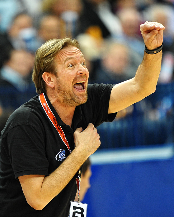 Erfolgreich war auch mein Test mein AF-S 200mm f/2 mit dem neuen 2-fach Konverter TC-20 E III von Nikon. Ich hatte auch den alten Konverter, aber der konnte mich nie richtig überzeugen. Bei Offenblende zu weich und für Sport auch zu langsam. Gestern konnte ich nun feststellen, dass der neue Konverter schon bei Offenblende in der Schärfe überzeugen kann. Schau Dir einfach mal die ersten beiden Bilder an, die sind mit der Objektiv-Konverter-Kombination bei Offenblende fotografiert worden. Das Bild von Heiner Brand übrigens mit ISO6400.