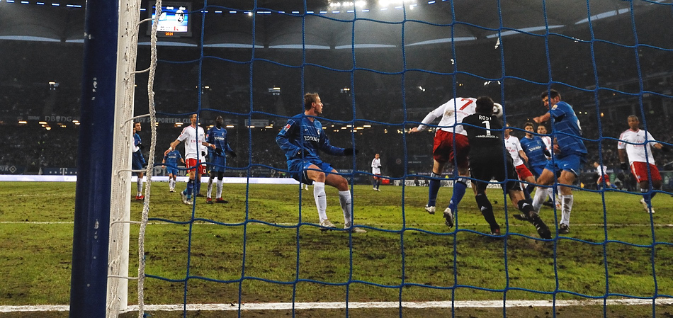 Die ISO konnte ich nicht so hoch drehen, um scharfe Bilder erwarten zu können, denn die D200 rauscht zu stark – oder: das Licht in der HSH Nordbankarena ist nicht gut genug 😉 Weiterhin ist die Brennweite nicht kurz genug, um das ganze Tor auf einem Bild ablichten zu können. Das ist aber notwendig, willst Du Torschüsse, die von beiden Seiten kommen, einfangen können.