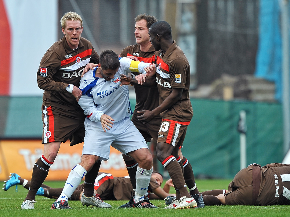Merkwürdige Stimmung am Millerntor: es ist Derby, aber ohne Gästefans kommt einfach keine Stimmung auf. Der fünfminütige Boykott der Fans auf der Südtribüne sah allerdings sehr gewaltig aus – und war meiner Meinung nach genau das richtige Zeichen gegen die zunehmende Tendenz seitens DFB und Polizei alle Fans zu kriminalisieren. Gut: in diesem speziellen Fall kam auch noch das zweifelhafte Verhalten von Herrn Littmann dazu, so dass ich problemlos einen kompletten Blogpost mit Bilder von Spruchbändern machen könnte. Dies ist aber eher ein Fotoblog – und „Tapeten“ zu fotografieren ist handwerklich jetzt nicht so kompliziert 😉 Ich verweise aber gerne auf die Fanseite von „breiteseite“, die am Ende ihres Artikels eine Slideshow mit vielen Transparenten haben.