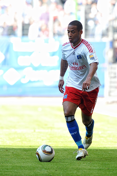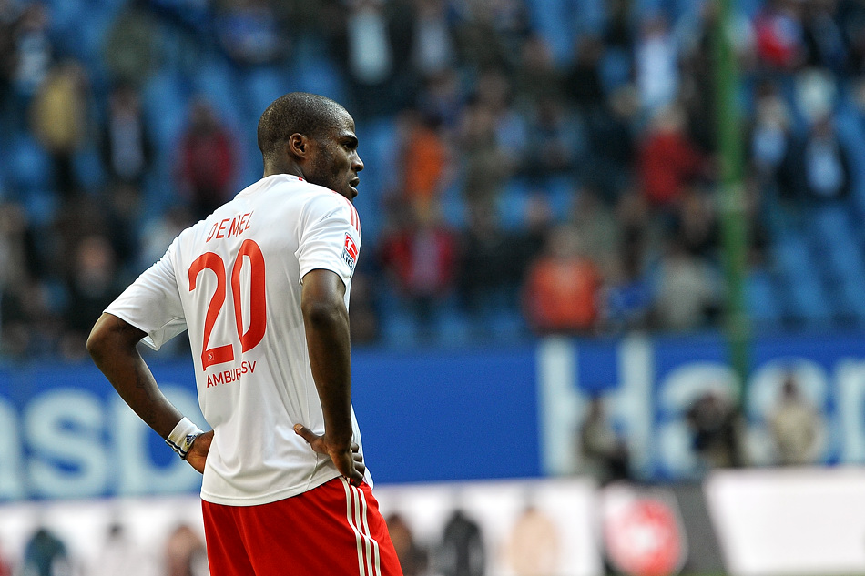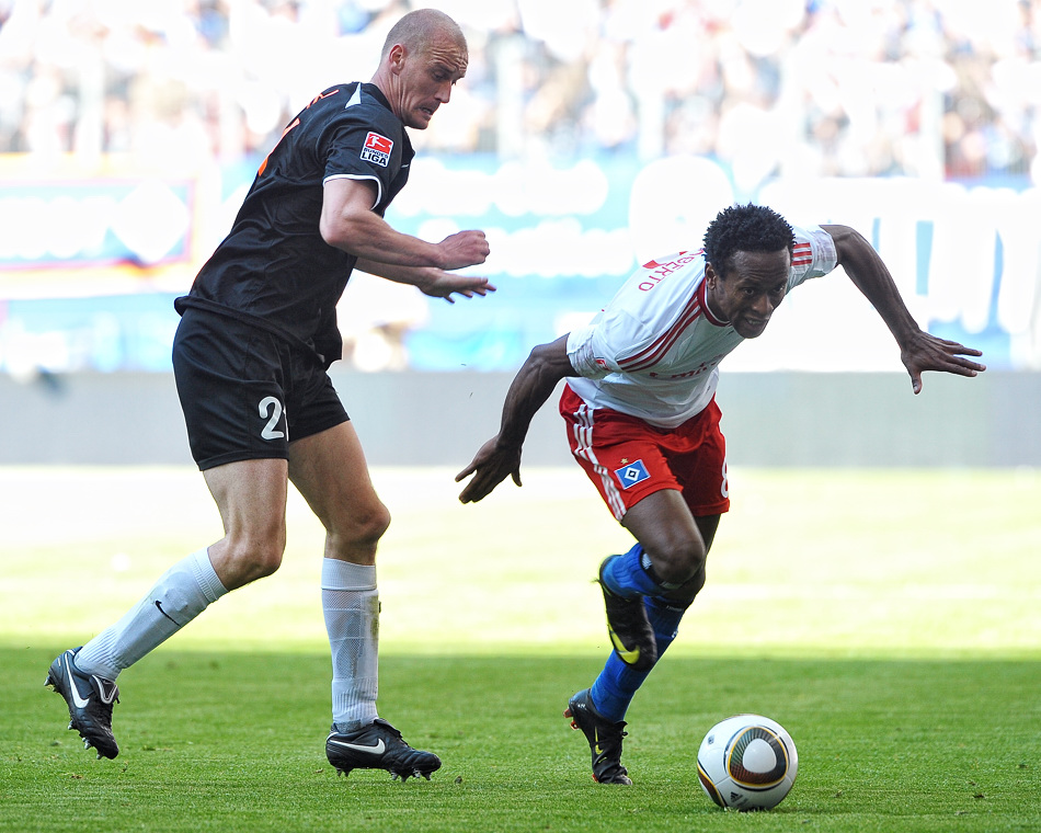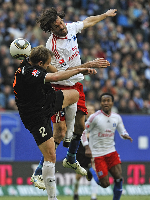 Beim Fussballspiel am Samstag vom HSV gegen Mainz 05 gab es äußerst ungünstige Lichtbedingungen: bis zur Mittellinie Schatten, danach greller Sonnenschein. Bei der Belichtung der Bilder bedeutete das mehr als 3 Blendenstufen Unterschied. Also statt Blende 13, Blende 4 – oder statt 1/1000s Belichtungszeit plötzlich 1/100s. Im obigen Bild ist der Helligkeitsunterschied gut zu sehen.