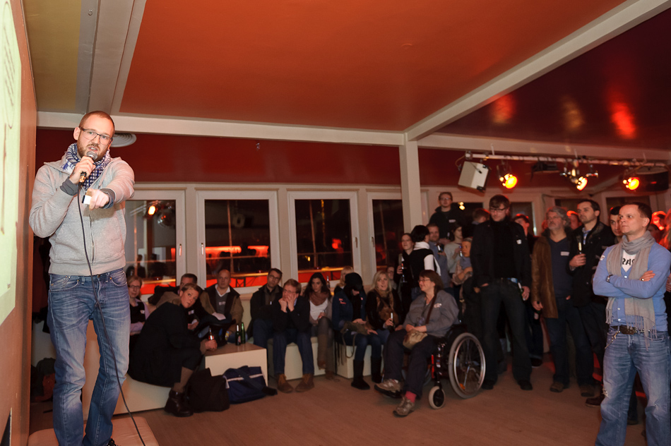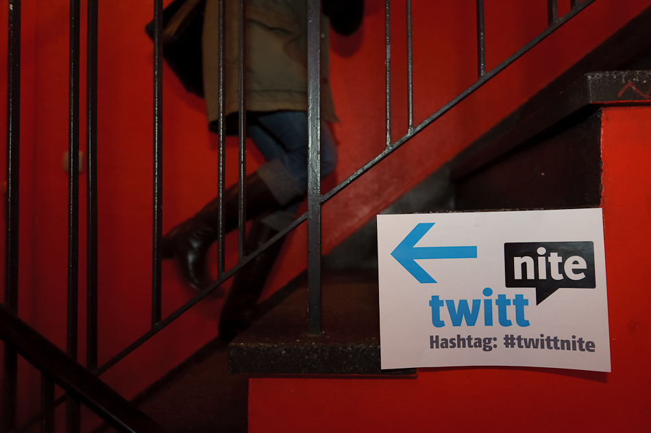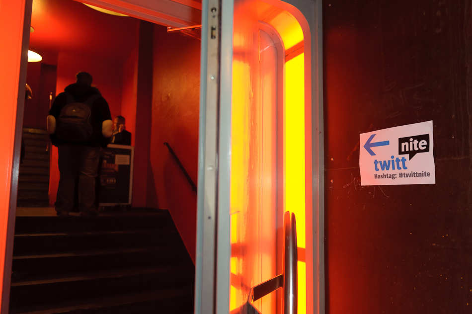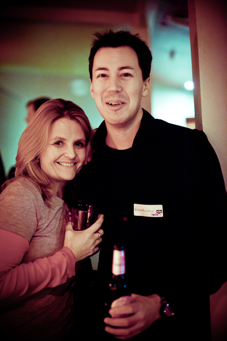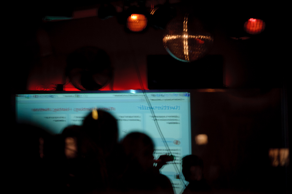 Aus Fotografensicht war der Veranstaltungsort der Twittnite nicht so richtig prickelnd: rotes Licht, rote Decke, alles ziemlich dunkel. Aber Fotografieren heißt Probleme lösen. Und die available light Bilder bei ISO6400 sehen in schwarzweiss doch auch ganz gut aus…