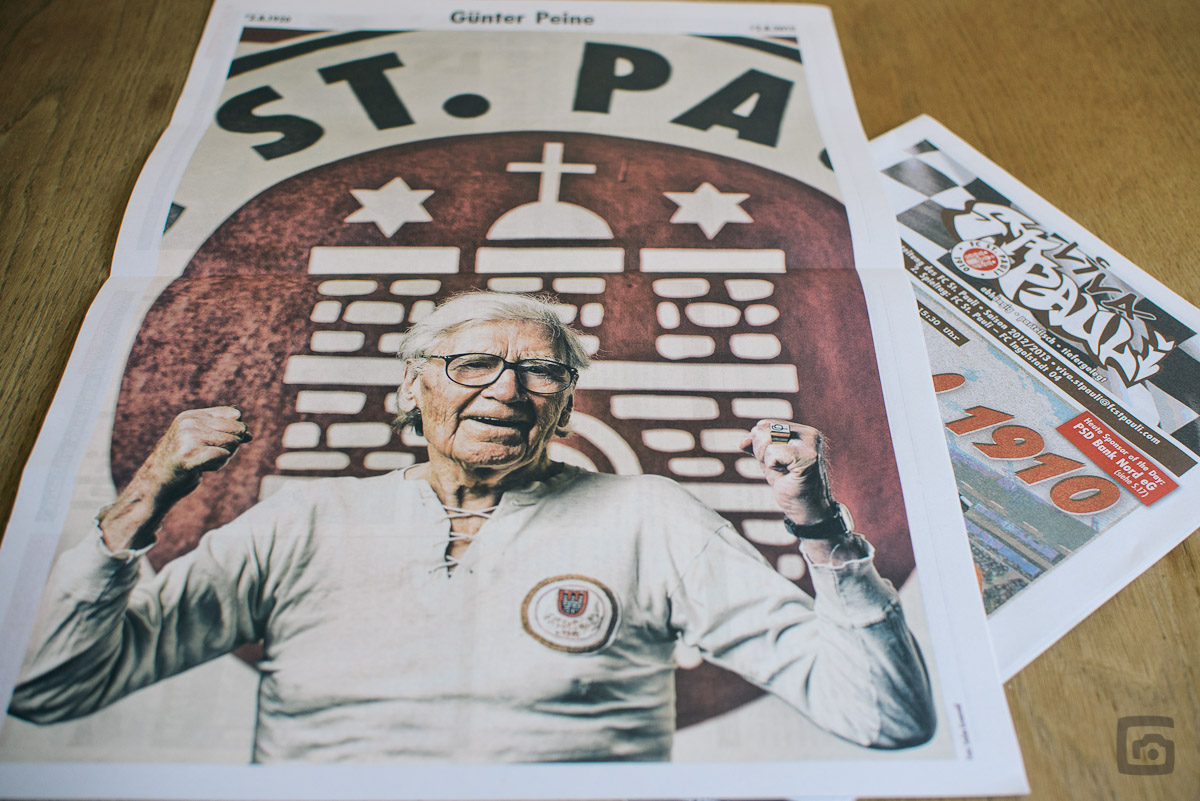 Auch wenn ich mir einen schöneren Anlass zur Veröffentlichung dieses Bildes vorgestellt habe, freue ich mich natürlich, dass mein Bild von Günter Peine eine solche Würdigung gefunden hat. So sah also gestern die Mittelseite der offiziellen Stadionzeitung des FC St. Pauli aus.