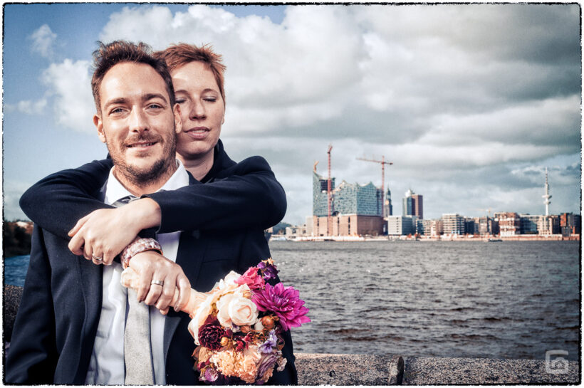 Die Beiden wollten unbedingt ein Bild mit dem typischen Hamburg im Hintergrund und hatten sich auch die Location schon ausgesucht. Das ist der Vorteil, wenn Du Fotografen bei ihrer Hochzeit begleiten darfst. Tja, und dann standen wir da und die strahlende Sonne kam schräg von hinten. Vor zwei Jahren wäre ich nun vermutlich ins Schwitzen zu kommen oder hätte später Stunden in der Nachbearbeitung gesessen. Aber mittlerweile habe ich als Hochzeitsfotograf ein Repertoire, dass ich in solchen Situationen einfach abrufen kann. Ich sehe das Problem und erahne die Lösung – der Rest ist dann schnell erledigt.