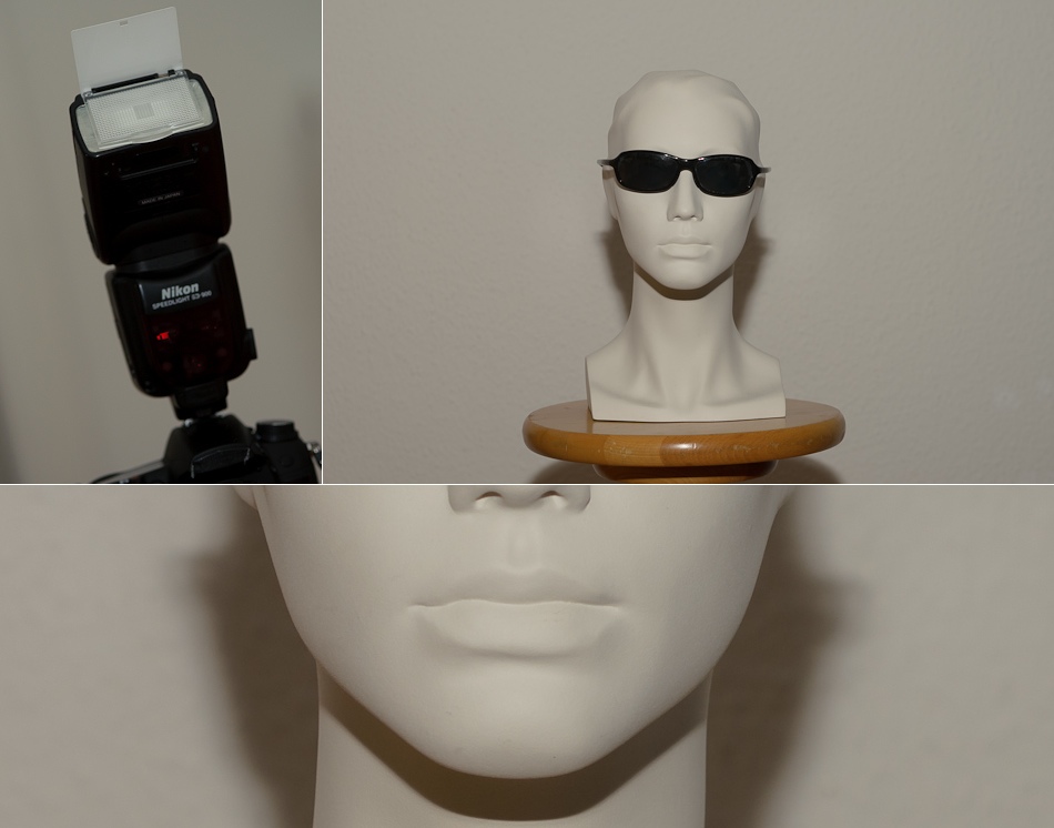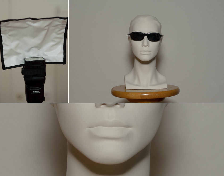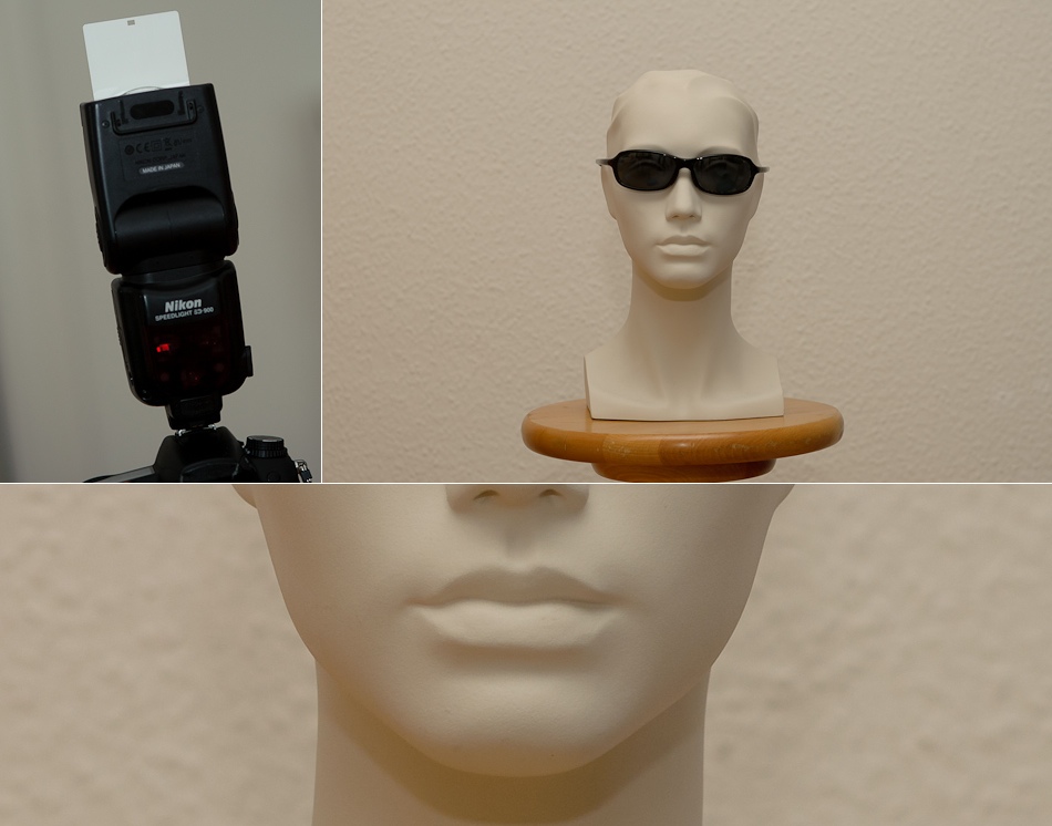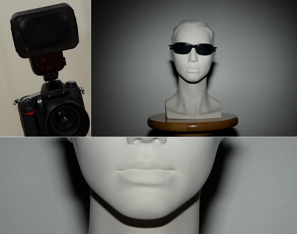 Im Nachfolgenden habe ich verschiedene Möglichkeiten des Arbeiten mit einem Aufsteckblitzes ausprobiert. Dabei stand der fotografierte Kopf ca. anderthalb Meter von der Kamera entfernt und ca. einen halben Meter von der weissen Wand. Die Kamera ist eine D7000 mit 50mm Objektiv – also Cropsensor mit Verlängerungsfaktor 1.5.