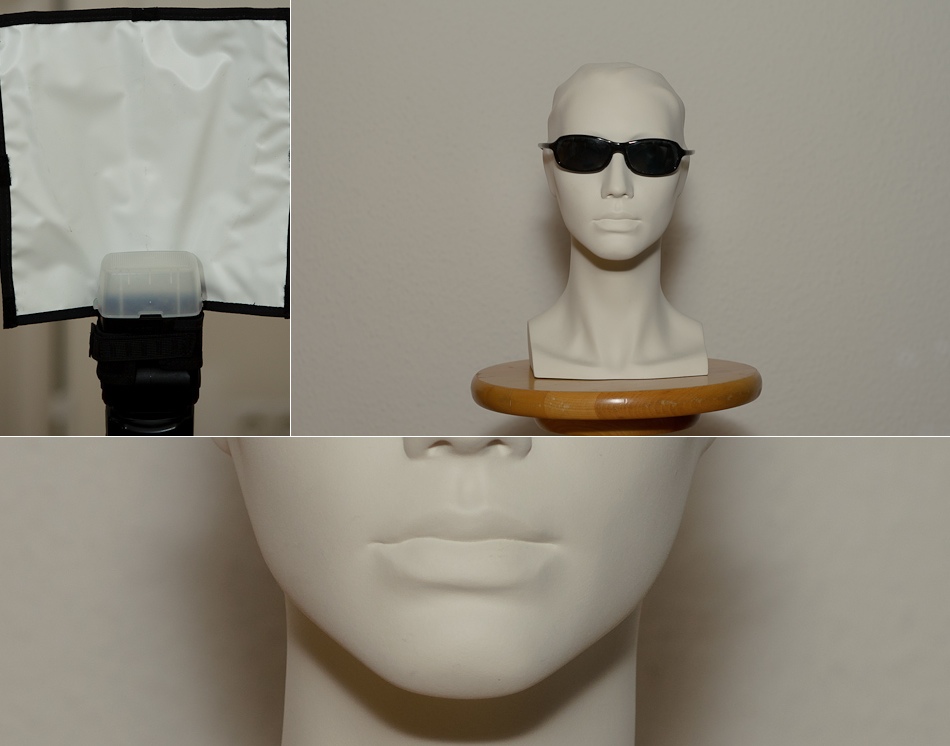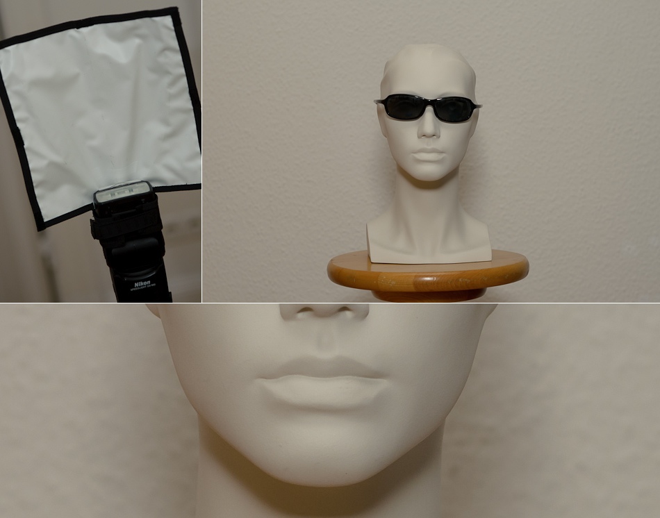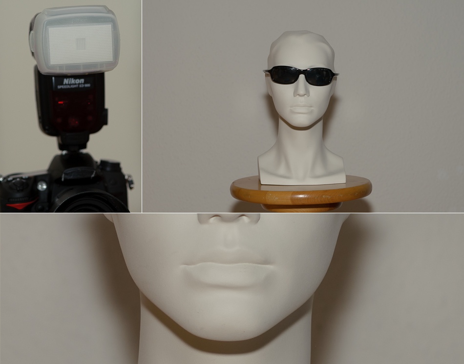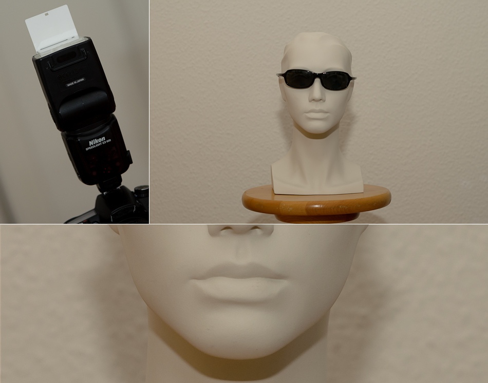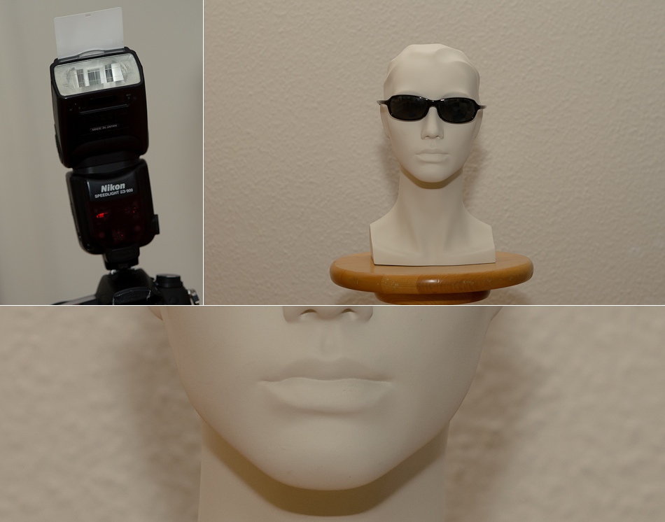 Im Nachfolgenden habe ich verschiedene Möglichkeiten des Arbeiten mit einem Aufsteckblitzes ausprobiert. Dabei stand der fotografierte Kopf ca. anderthalb Meter von der Kamera entfernt und ca. einen halben Meter von der weissen Wand. Die Kamera ist eine D7000 mit 50mm Objektiv – also Cropsensor mit Verlängerungsfaktor 1.5.
