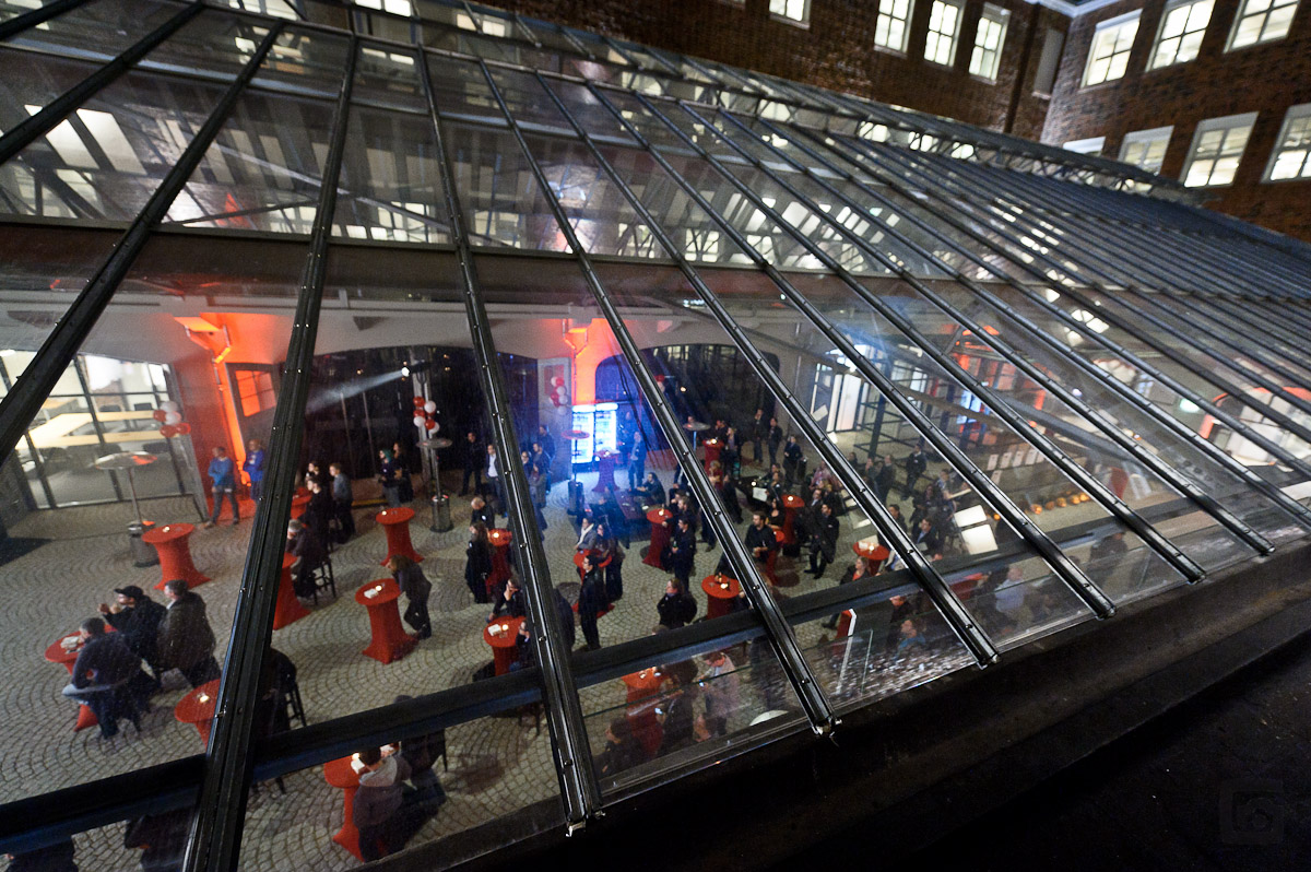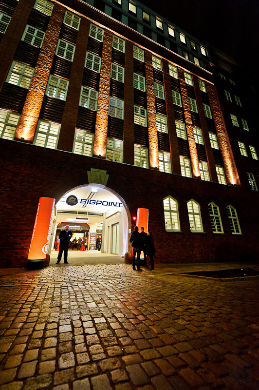 Veranstaltungsort war die Firma Bigpoint in der Hamburger Neustadt. Als Nichtgamer hatte ich von dieser Firma noch nie was gehört – und war ob des opulenten, aber schlichten Baus positiv überrascht. Da wird Kundenbetreuung ernst genommen. Offensichtlich nicht nur für die Gamer der Flashspiele, sondern auch für Besucher – und Fotografen: danke, dass mein Sonderwunsch so problemlos umgesetzt wurde.