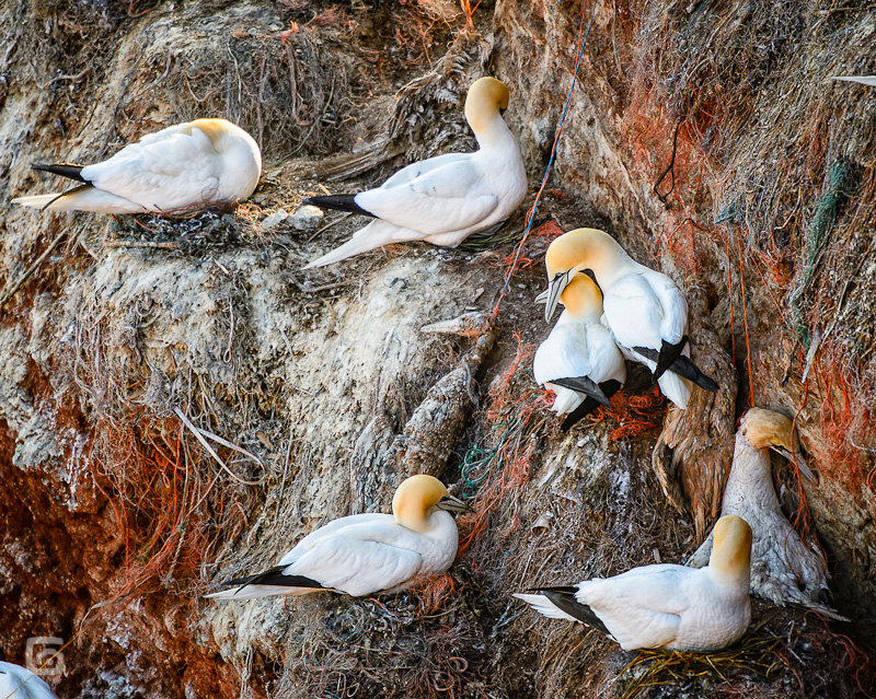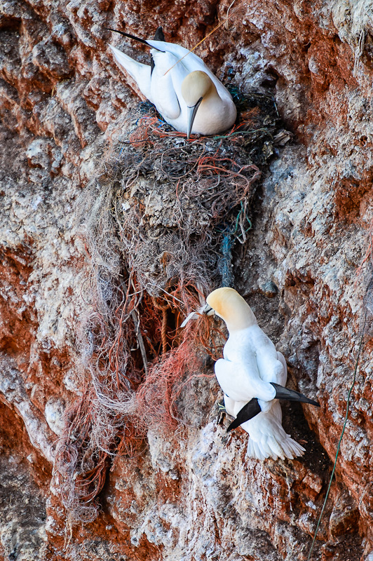 Wir haben dann ein wenig recherchiert: Basstölpel fischen aus dem Meer alles mögliche, um ein Nest zu bauen. Dabei nutzen sie unter anderem auch Teile von achtlos ins Meer geworfenen Fischereinetzen. Manche Tiere verfangen sich in den Netzen und verenden elendig. Andere Vögel nisten neben verwesenden Artgenossen. Traurig. Und unnötig. Die Vögel sterben an unserem Zivilisationsmüll.