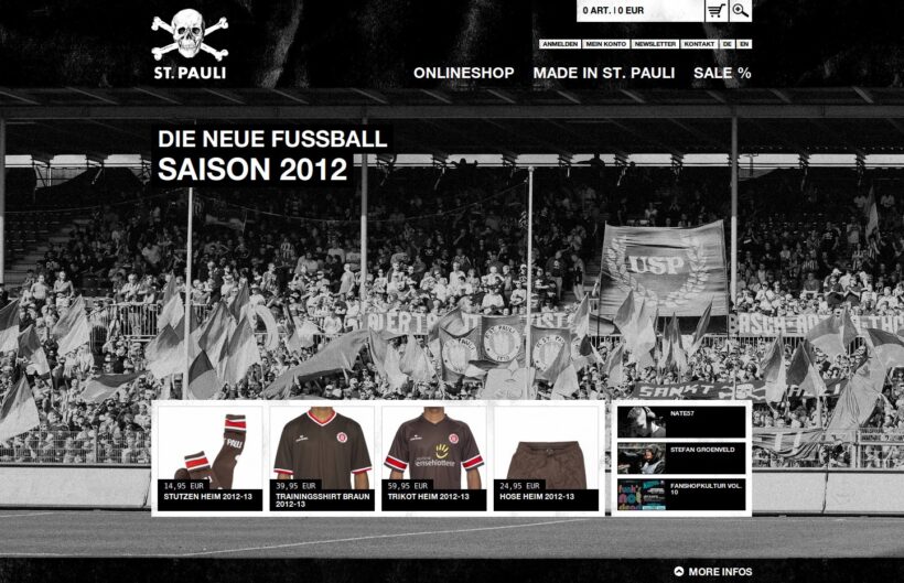 Seit einigen Tagen ist der neue offizielle Fanshop vom FC St. Pauli online. Wer auf der offiziellen FC St. Pauli Homepage dem Link zum Fanshop (sehr weit unten auf der Seite) folgt, kann als Hintergrund eins meiner Bilder sehen. Siehe Screenshot. Allerdings siehst Du diesen Hintergrund nicht, wenn Du den Fanshop direkt aufrufst. Da ich an Upsolut – dem Betreiber des Fanshops – noch mehr Bilder verkauft habe, vermute ich mal, dass das Hintergrundbild irgendwann noch ausgetauscht wird. Mal schauen, ob regelmäßiger Besuch belohnt wird 🙂