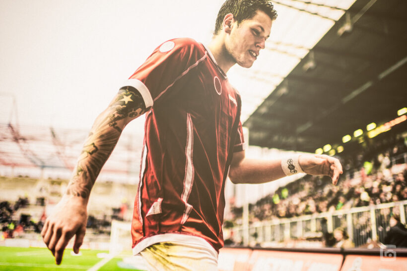 Als Daniel Ginczek nach dem Spiel endlich in die Katakomben durfte, war der Platz schon ziemlich leer, aber die Zuschauerränge auf der Süd noch gut gefüllt. Daher hoffte ich auf eine Möglichkeit Stadionathmosphäre verbunden mit einem recht klarem Bild aus nächster Nähe von dem jungen Torjäger zu bekommen. Ich kauerte mich mit meinem 35mm Objektiv und meiner Nikon D800e neben die Werbebande, um einen tieferen Kamerastandpunkt als sonst üblich zu ermöglichen. Schnell ungefähre Entfernung (der Autofokus der Linse ist nicht unbedingt der Schnellste) eingestellt, Belichtung eingerichtet und gewartet. Bei Offenblende ist ein solches Foto immer mit Risiko verbunden, denn der Schärfebereich beträgt nur rund 15 cm. Meine Schätzungen haben aber ganz gut gepasst…