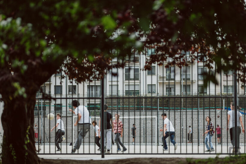 Und dann habe ich hier noch ein Bild. Als ich auf meinem Weg zum Grab von Jim Morrison – vor 31 Jahren in Paris gestorben – an dieser Szenerie vorbeikam, musste ich sofort an Jay Maisel denken. Dieser wunderbare New Yorker Fotograf hat mich schon auf manchen Gedanken gebracht. So auch diesmal, denn ich hatte in Erinnerung, dass er gerne spielende Menschen durch defekte Zäune fotografiert – das ergibt, wenn Jay Maisel es macht, interessante Strukturen. Einen defekten Zaun hatte ich zwar nicht, aber dafür ein manuelles Tele zur Hand. Auch wollte ich keine Strukturen, ich wollte eine Spielszene einfangen. Obwohl ich mit Sportfotografie ein klein wenig Erfahrung habe, ist das Fotografieren sich unkontrolliert bewegender Objekte mit dem Zeiss Makro-Planar T* 100mm f/2 ohne Autofokus und bei Offenblende schon eine Herausforderung. Zumindest wenn Du, wie erwähnt, unbedingt eine Spielszene ablichten willst. Es ist mir gelungen, beim ersten Versuch – viele weitere nachfolgende Versuche haben nicht ansatzweise diese Qualität.