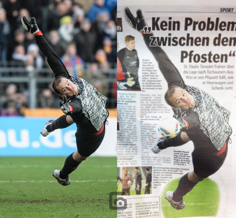 Ich fasse kurz aus meiner Sicht zusammen: die Bildmanipulation macht aus dem Bild durchaus ein gutes Bild, aber sie verändert die Bildaussage komplett. Gerade auch mit dem geschriebenen Text. Auf dem Bild ist das Gegentor zum 2:1 für Hoffenheim beim Testspiel vor rund zwei Wochen zu sehen. Benedikt Pliquett greift leider ins Leere. Die gedruckte Version impliziert eine tolle Parade – und so steht es ja auch im Bildtext: „…erwischt den Ball noch mit den Fingern…“ Einen Ball, den es gar nicht gibt. Ist das schlimm?