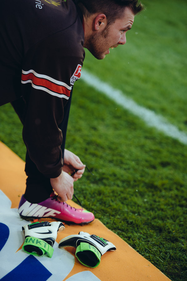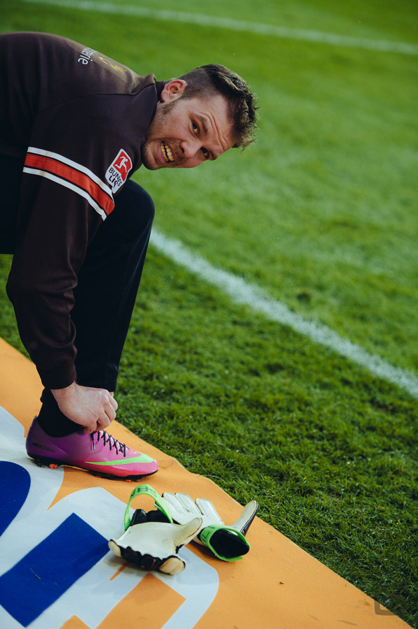 Vor dem Spiel wanderte ich auf Motivsuche durch das Stadion an der alten Försterei, als ich Benedikt Pliquett am Rand des Spielfelds sah. Er band sich gerade die Schuhe zu. Der Farbkontrast zwischen seinen pinkfarbenen Schuhen, der orangenen Werbeplane und dem grünen Rasen fand ich interessant.