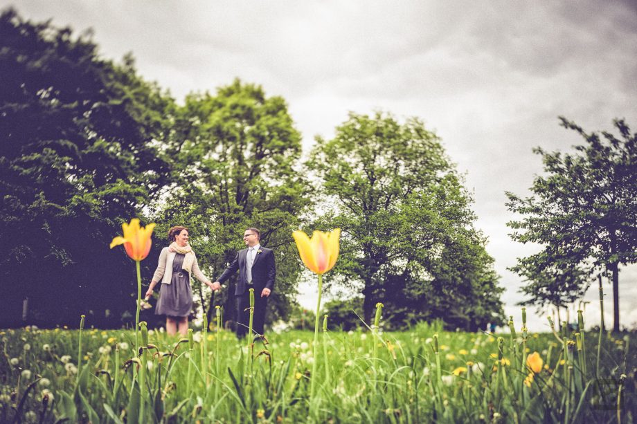 Glück hatte ich nicht nur mit dem herzlichen Paar, sondern auch mit dem direkt gegenüber dem Altonaer Rathaus gelegenen Altonaer Balkon. Eigentlich hatte ich ein Bild vom frischvermählten Paar mit Blick über den Hamburger Hafen im Kopf, aber da wusste ich noch nicht, dass die Wiese dort gerade frisch blühte. So entstand dieses liebevolle Foto, bei dem ich meine Rasenallergie vergessen hatte und meinen Kopf sehr nah an den Boden halten musste, um bei dem manuell zu fokussierenden Objektiv den Hauch einer Chance auf ein scharfes Bild zu haben. Um ehrlich zu sein, ich habe fast nichts gesehen. Und ja: ein Klappdisplay wäre an dieser Stelle echt hilfreich gewesen.