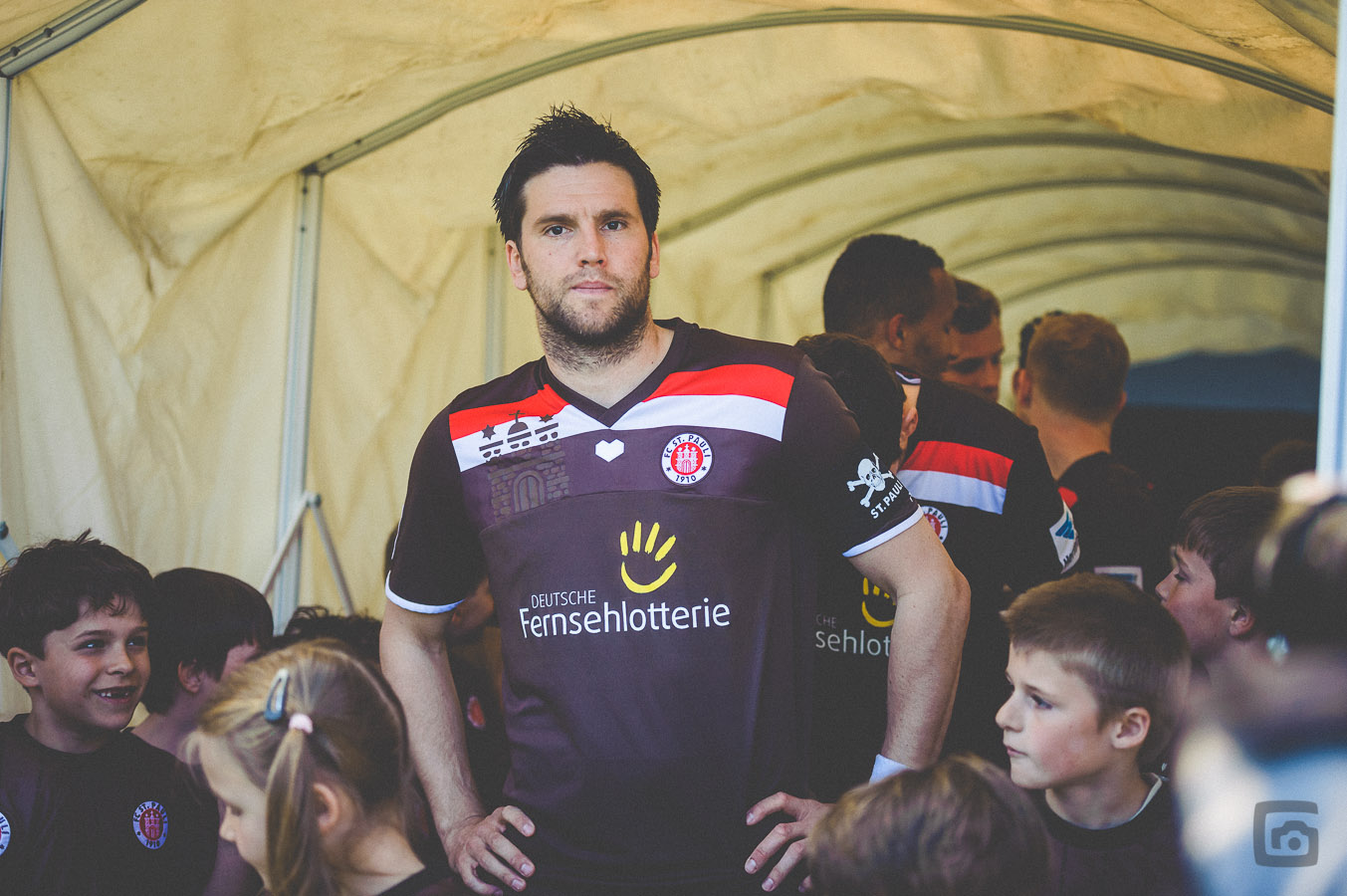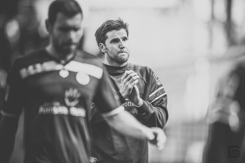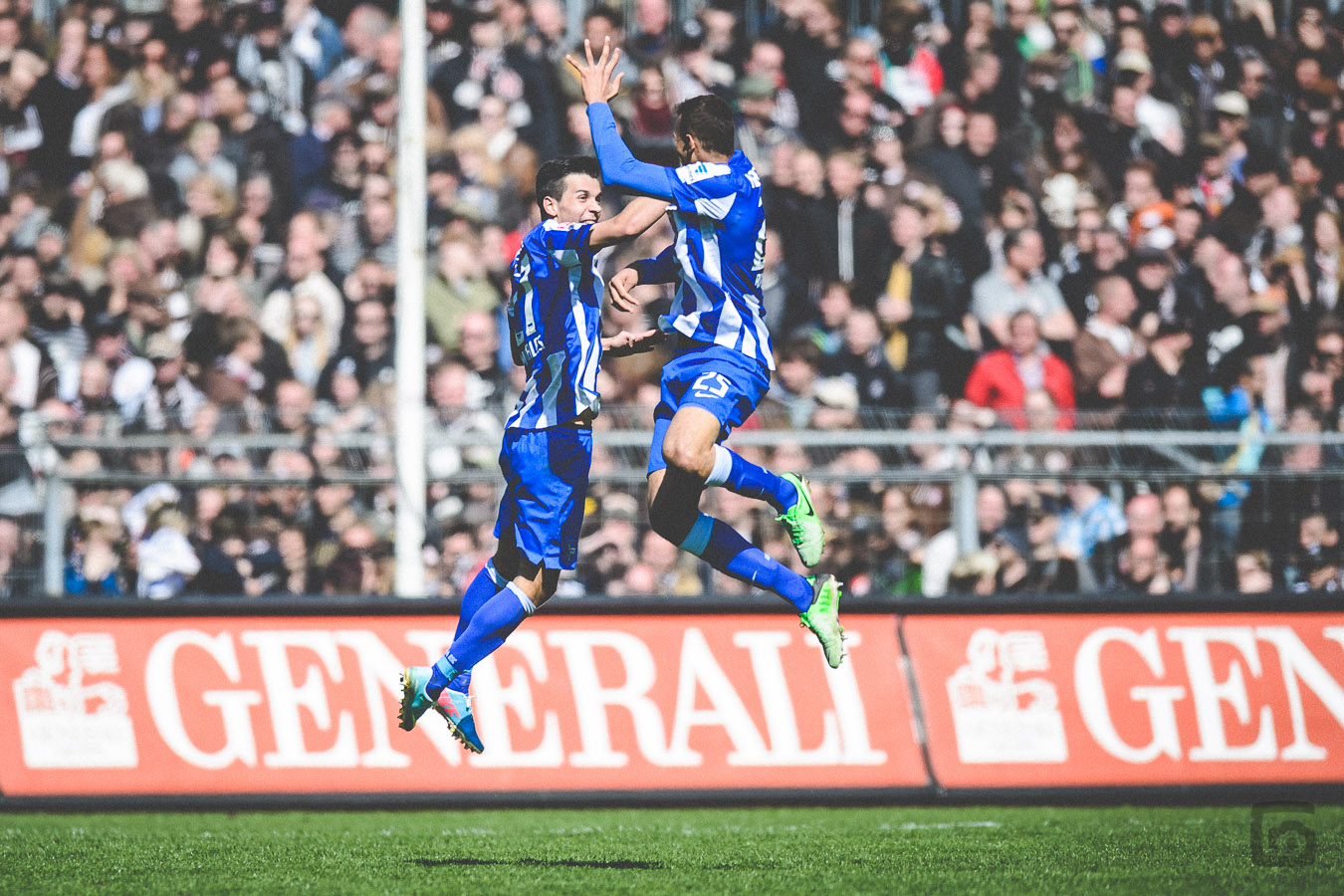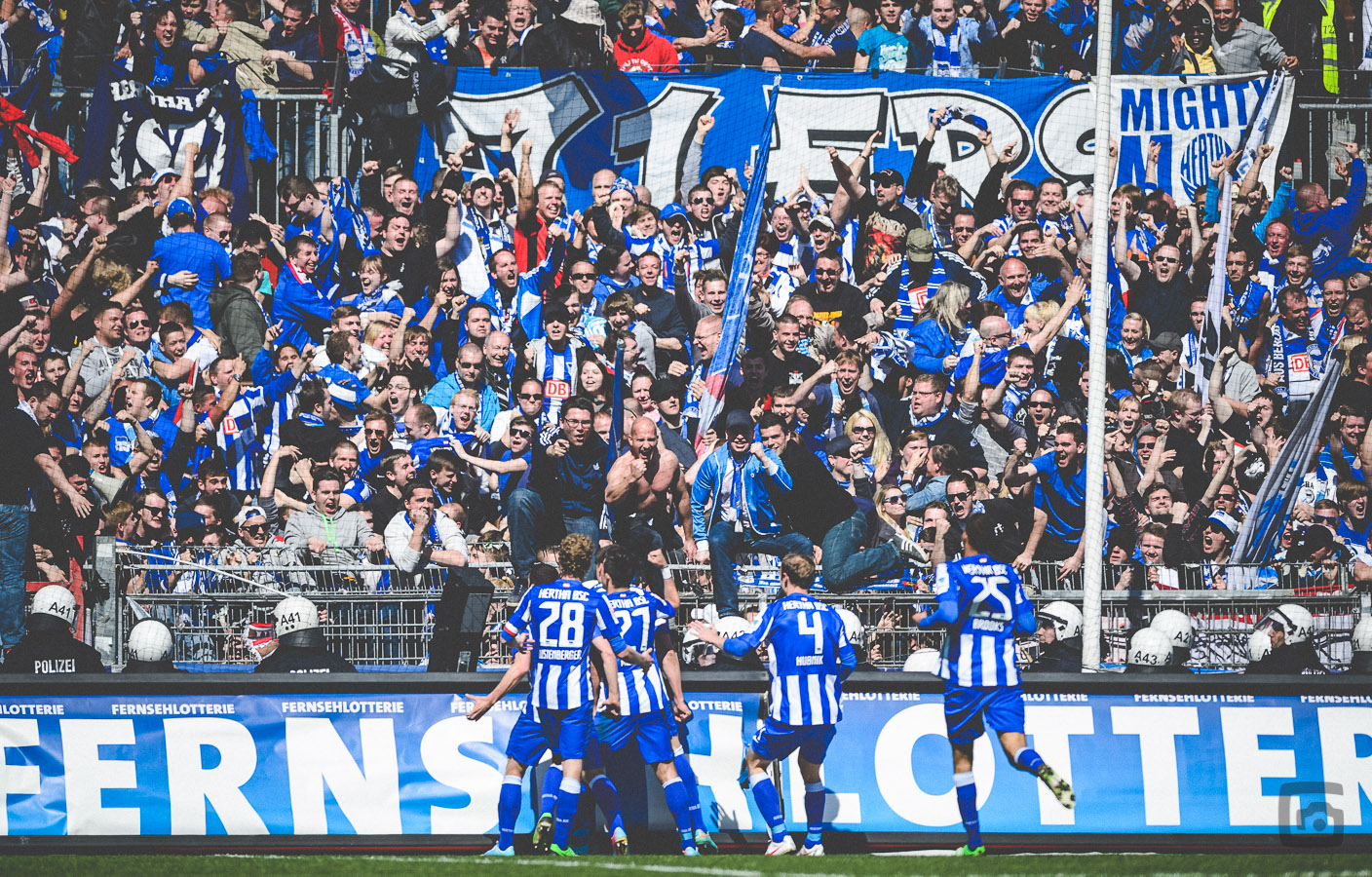 Bei dem Sonnenschein bin ich übrigens froh, dass Nikon eine Technik namens „Active D-Lighting“ in ihre Kameras eingebaut hat. Der wahnsinnig starke Kontrast kann dank Active D-Lighting gemildert werden – wer in RAW fotografiert, braucht das nicht zu wissen, aber meine Bilder müssen vom Spielfeldrand direkt druckfähig verschickt werden. Da ist es ganz nützlich, technische Helferlein in den Kameras eingebaut zu haben. Bei Portraitaufnahmen kannst Du diese harten Kontraste wegblitzen, aber bei Sportbildern könnte es den Spielverlauf etwas stören, wenn ständig ein Assistent mit einem mobilen Blitzgerät den ballführenden Spieler verfolgt.