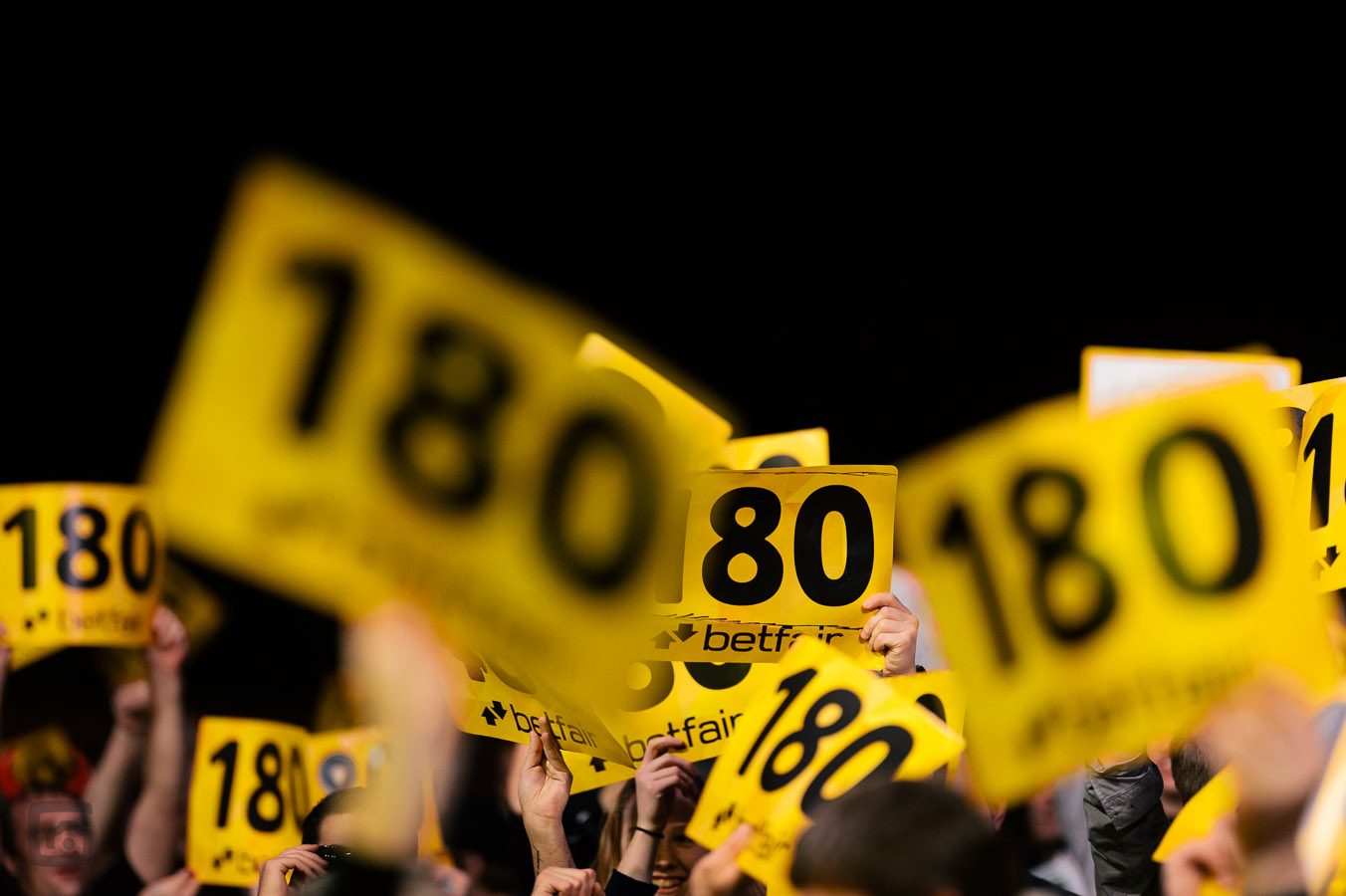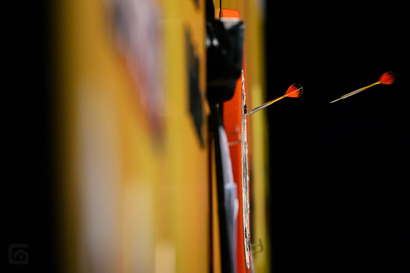 Alle Bilder wurden übrigens mit der Nikon D4 und dem AF-S 200mm f/2 fotografiert. Da die Spieler sich kaum bewegten, war ein großer Schärfebereich nicht notwendig und ich konnte so noch ein paar Blendenstufen gewinnen. Als Belichtungszeit wählte ich ein 1/800s und war überrascht, dass die Darts trotzdem mit Bewegungsunschärfe auf meinen Sensor gebannt wurden.