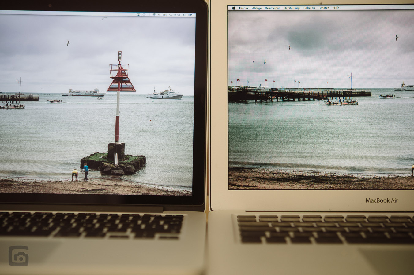 Beide Monitore sind nicht kalibriert, da ich unterwegs nicht farbecht arbeiten muss. Der Bildschirmhintergrund ist übrigens diese Szenerie aus Helgoland.