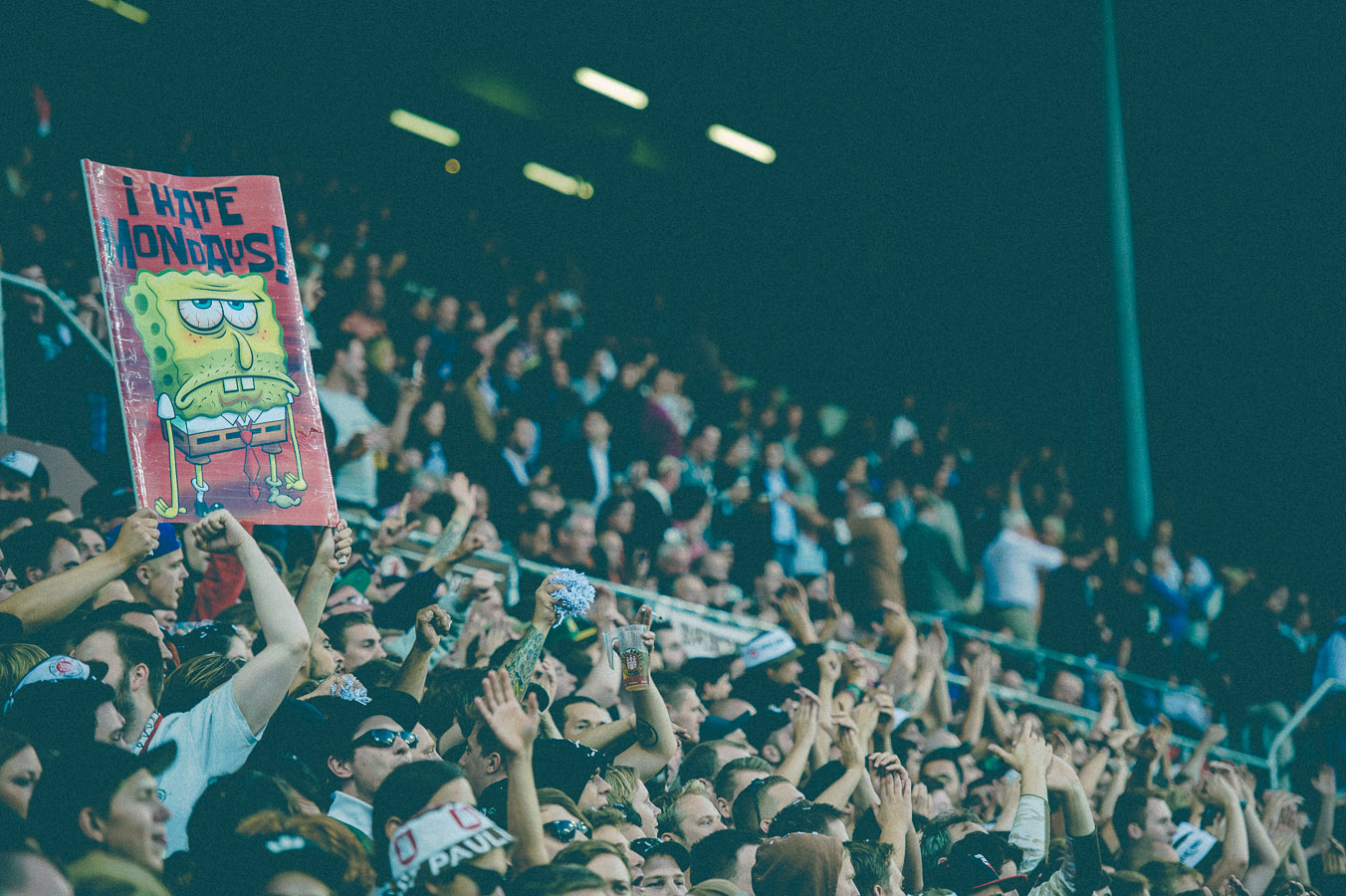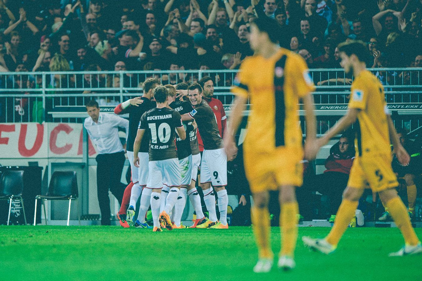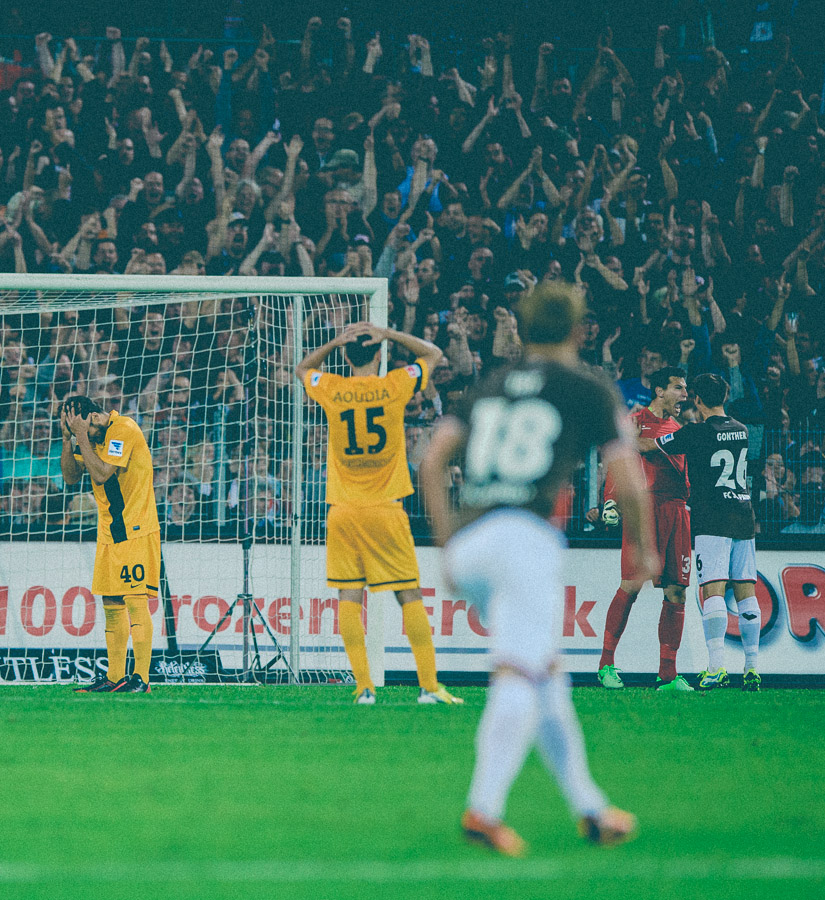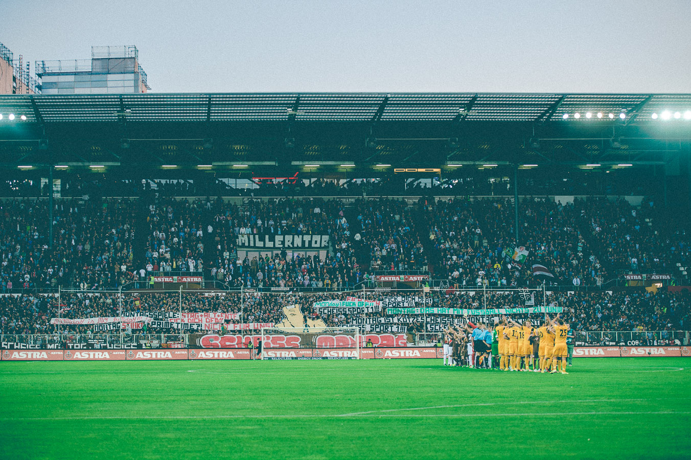 So wird das nichts! Seit Jahren bemängeln die Fans am Millerntor, dass Montagabendspiele doof sind und DSF bzw. Sport1 und alternativ Sky sie mit dieser Spielansetzung in Ruhe lassen sollen. Gestern wäre also wieder mal die beste Möglichkeit gewesen, den Fernsehsendern den Mittelfinger zu zeigen. Das klappte aber nur zu Spielbeginn. Zum Spielende werden sich die Fernsehverantwortlichen die Hände reiben und sich denken, dass sie alles richtig gemacht haben. Dramatischer Spielverlauf – besonders in den letzten 10 Minuten – und orkanartige Stimmung wurde am Millerntor geboten. Dazu kamen noch knappe Fehlentscheidungen, glückliche Sieger inklusive One-Touch-Helden und niedergeschlagene Verlierer, die kurz zuvor wie sichere Sieger ausgesehen haben. Eben alles, was ein Fussballspiel würzt.