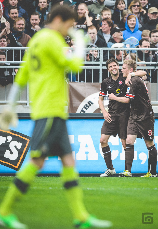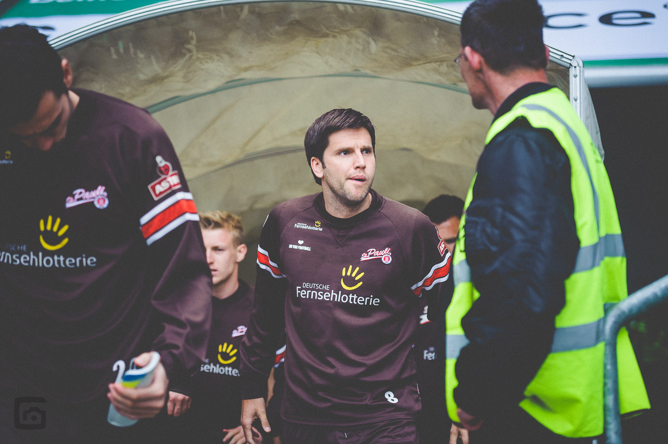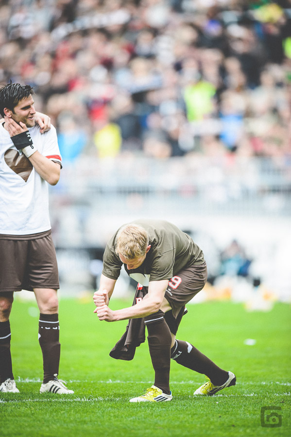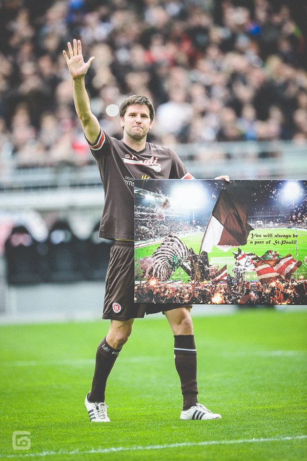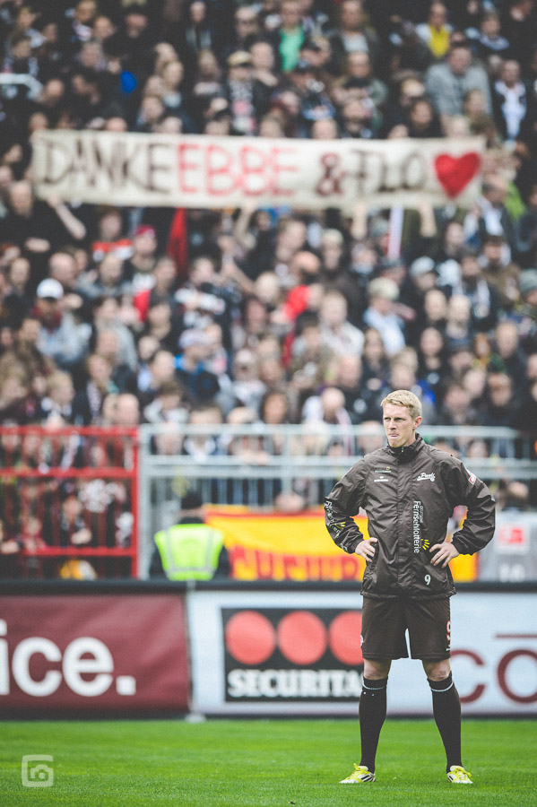 Ich gebe zu, dass mir diesmal nach Spielschluss bei der wahnsinnig tollen Stimmung am Millerntor und den Szenen rund um die letzten Schritte von Ebbers und Bruns auf dem heimischen Rasen die ein oder andere Träne über die Wangen gelaufen ist. Gut, dass die Nikon D4 so einen großen Body hat und das vor den Kollegen verborgen hat.