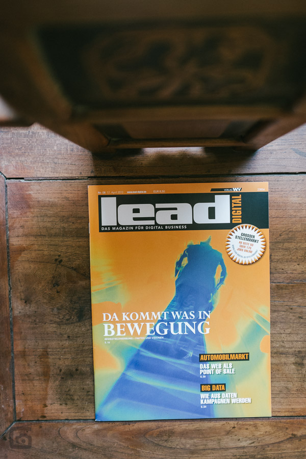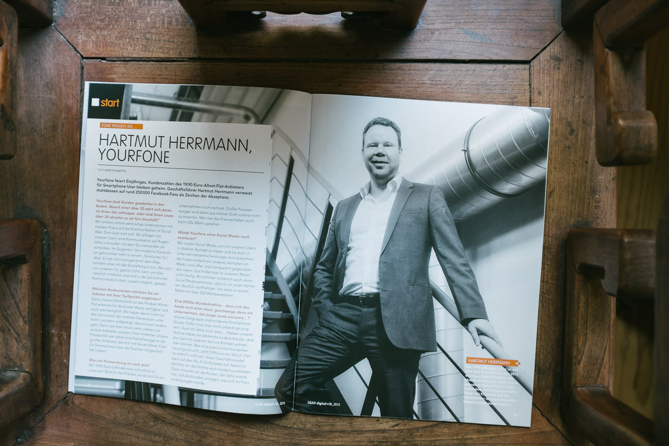 Das Magazin Lead ist ein 14-tägig erscheinendes Fachblatt aus dem Verlag W&V und richtet sich an „(…)Digital-Professionals und Online-Marketer(…)“ {Quelle: lead-digital.de}. In der 8. Ausgabe erschien ein Interview mit Hartmut Herrmann, dem Chef von Yourfone. Der Trendsetter im Telefonmarkt Yourfone feiert in einigen Tagen einjähriges Bestehen. Ich hatte Hartmut Herrmann von etwas mehr als einem Jahr vor der Linse, um die offiziellen Firmenfotos zum Start des Unternehmens zu machen. Was liegt da näher, als eins meiner Bilder als grossformatiger Hintergrund zum Interview zu drucken.