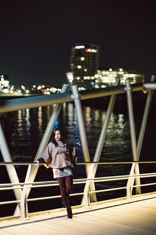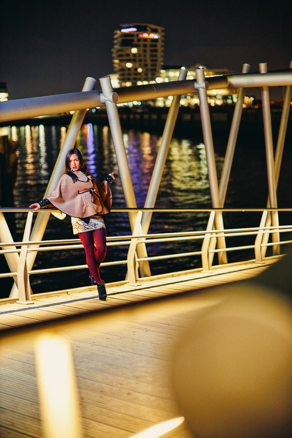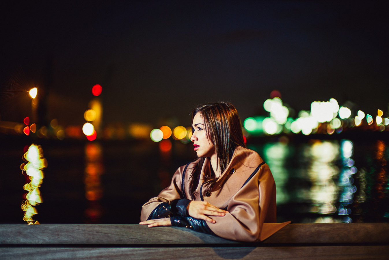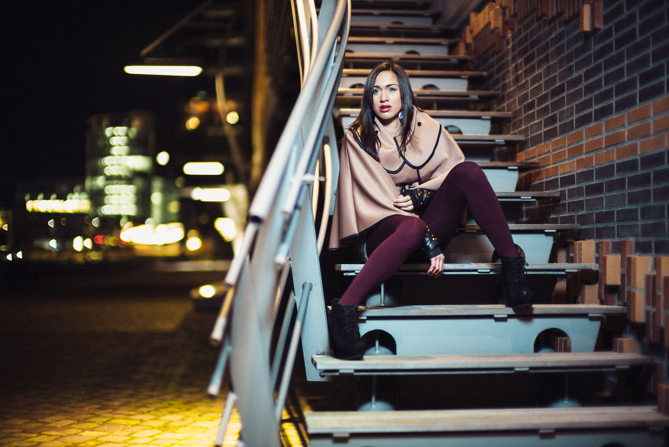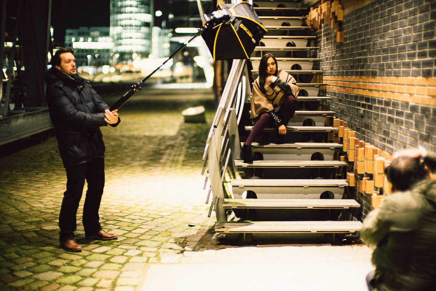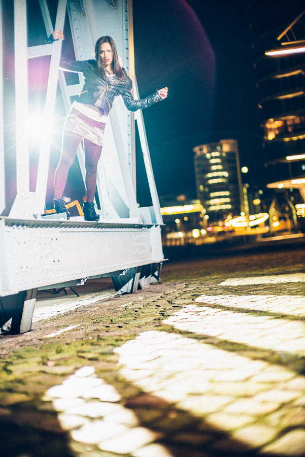 Das Bild ist komplett durch vorhandenes Licht entstanden. Wobei „Licht“ in diesem Zusammenhang übertrieben ist, denn es war recht dunkel auf dem Übergang. Ich fotografierte bei Offenblende mit meinem Noctilux – also f/0,95 – bei ISO2000 und einer Belichtungszeit von 1/12s! Ohne Stativ. Und ich war schon beim Fotografieren glücklich, dass ein klein wenig Wind aufkam und die Haare von Rose leicht aufwirbelten. Für mich hat sich der Abend allein wegen dieses Bildes gelohnt.