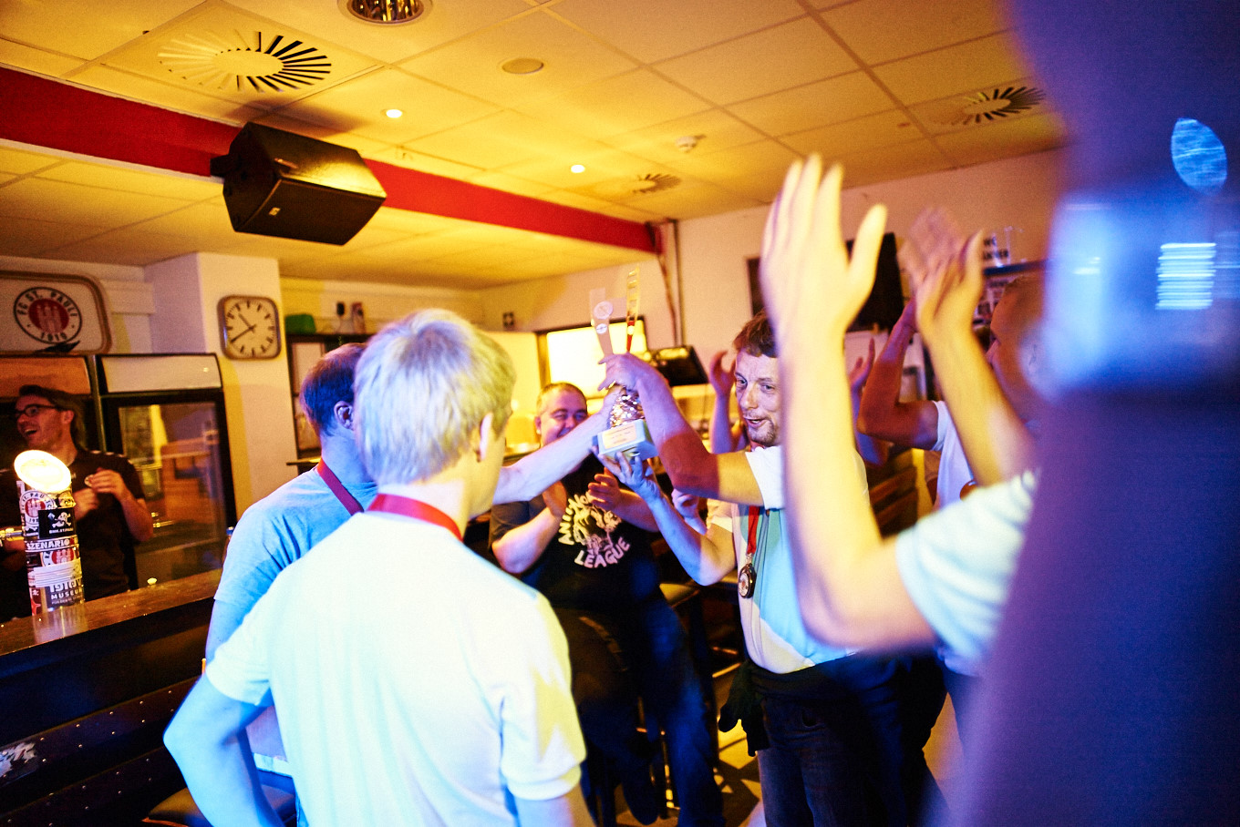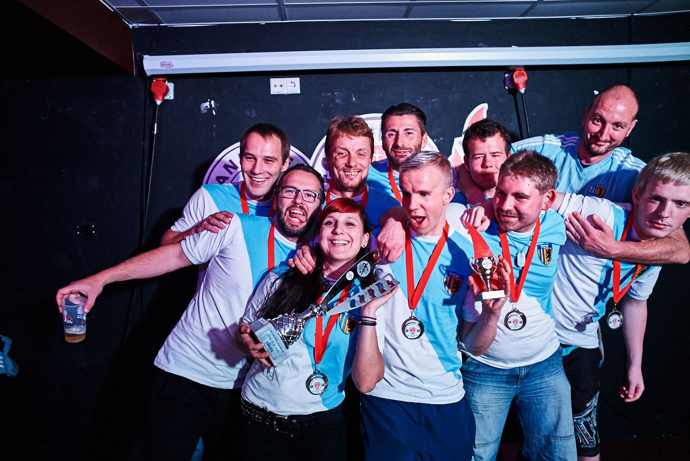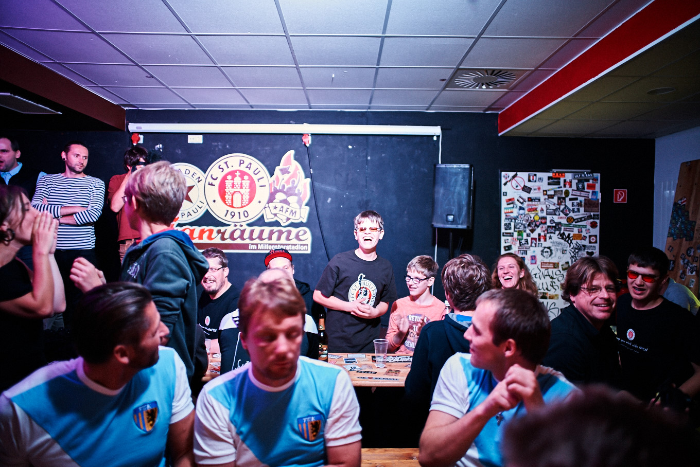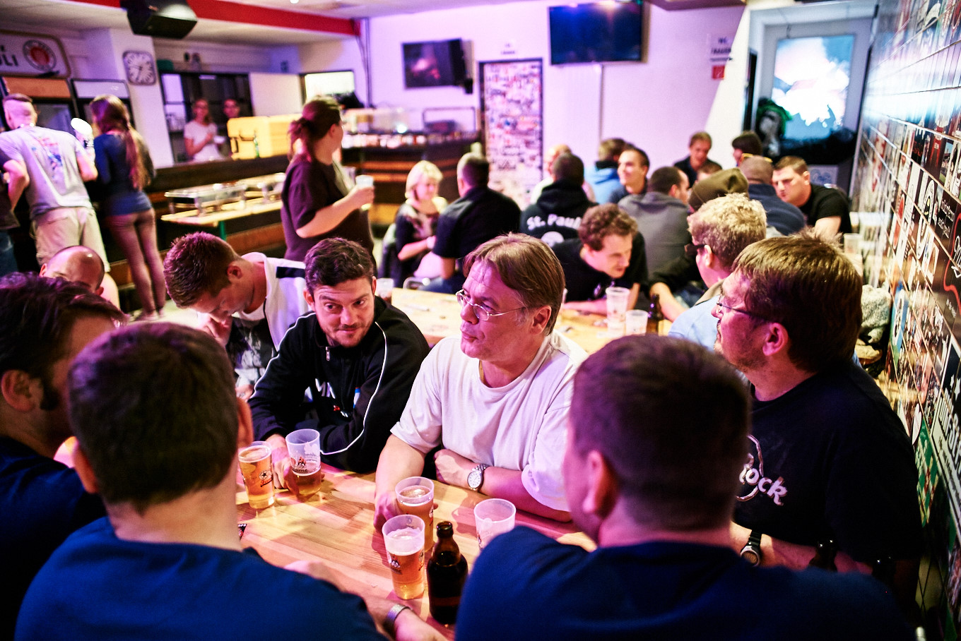 Anschließend wurde in den Fanräumen noch gemeinsam das Hallenmasters gefeiert. Natürlich gab es Pokale, leckeres Essen, tolle Gesangseinlagen, leckeres Bier und tschechischen Schnaps. O-Ton vom Blindenfussballer aus den Reihen vom FC St. Pauli: „Das Zeug trinke ich nicht, da wirst du nur blind von.“