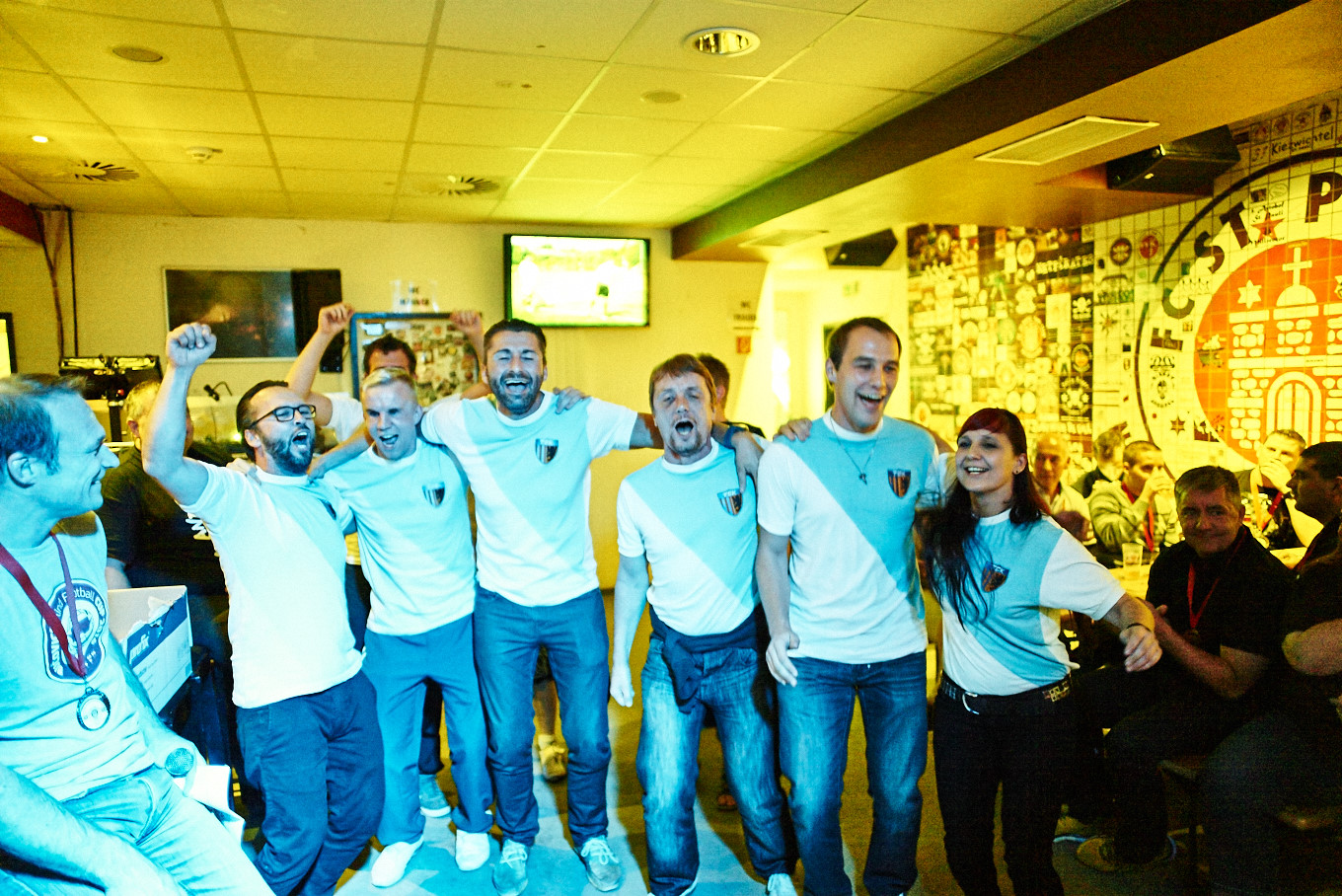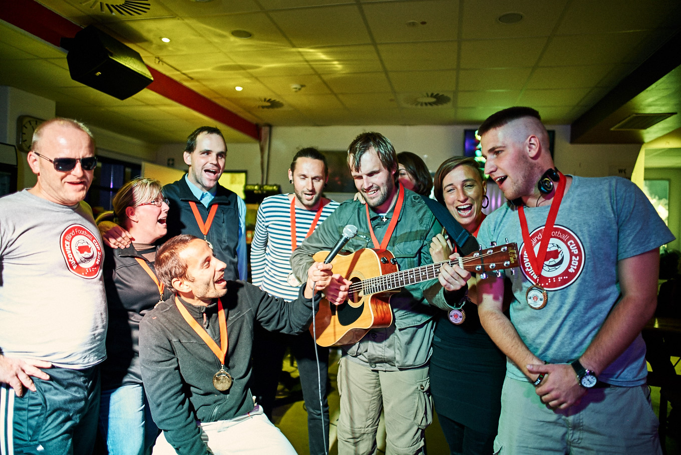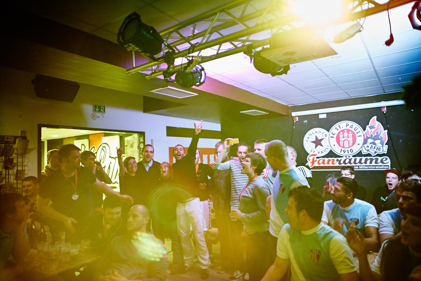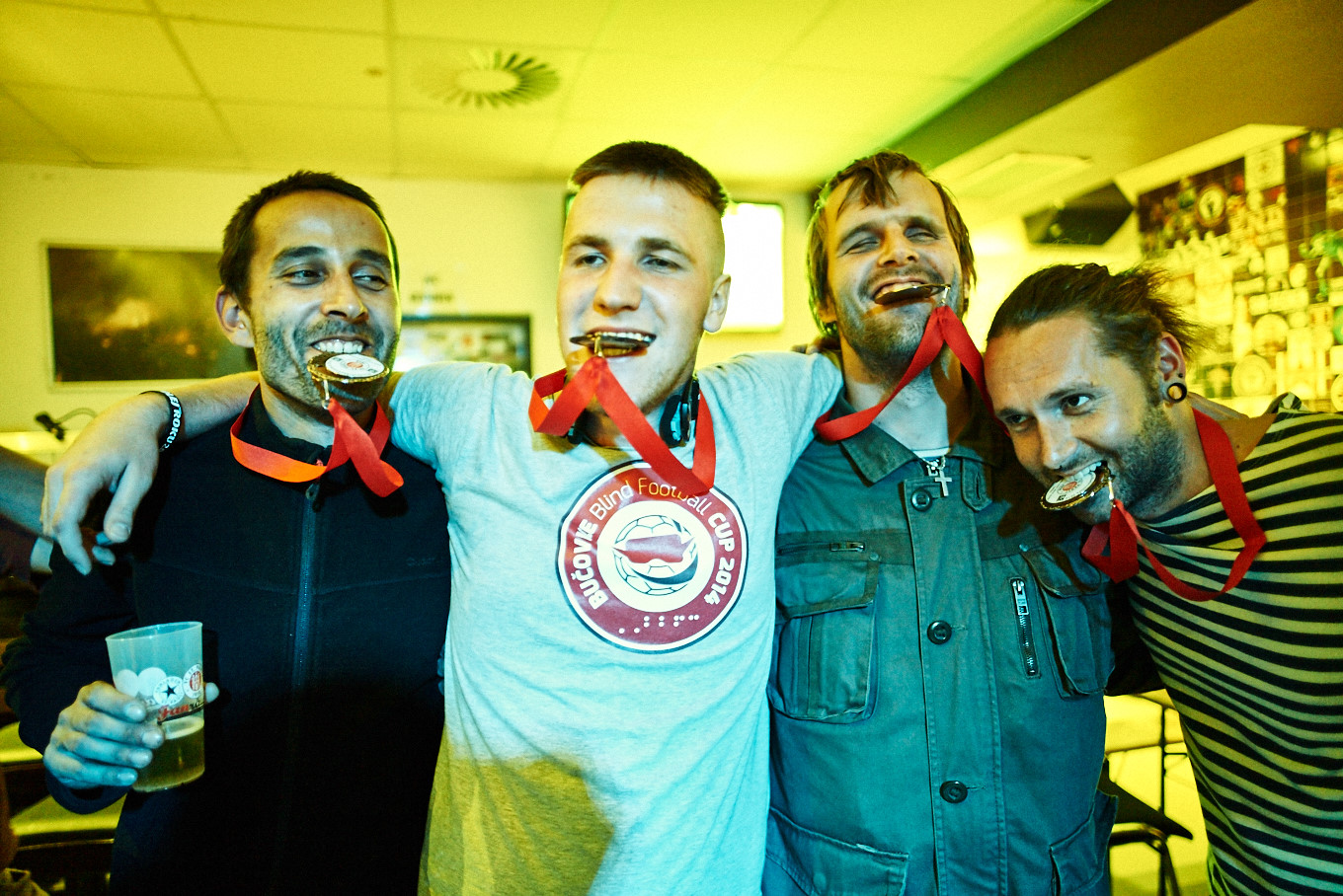 Anschließend wurde in den Fanräumen noch gemeinsam das Hallenmasters gefeiert. Natürlich gab es Pokale, leckeres Essen, tolle Gesangseinlagen, leckeres Bier und tschechischen Schnaps. O-Ton vom Blindenfussballer aus den Reihen vom FC St. Pauli: „Das Zeug trinke ich nicht, da wirst du nur blind von.“