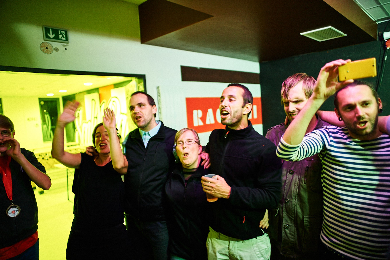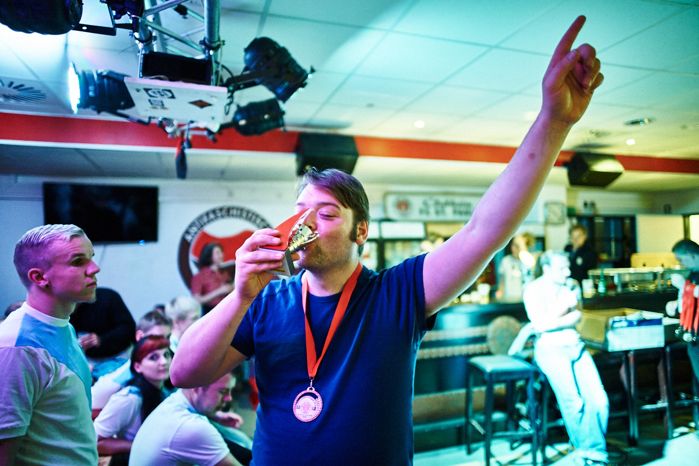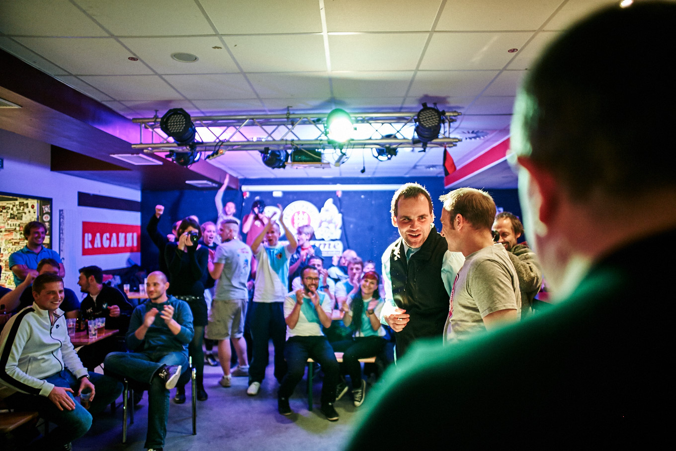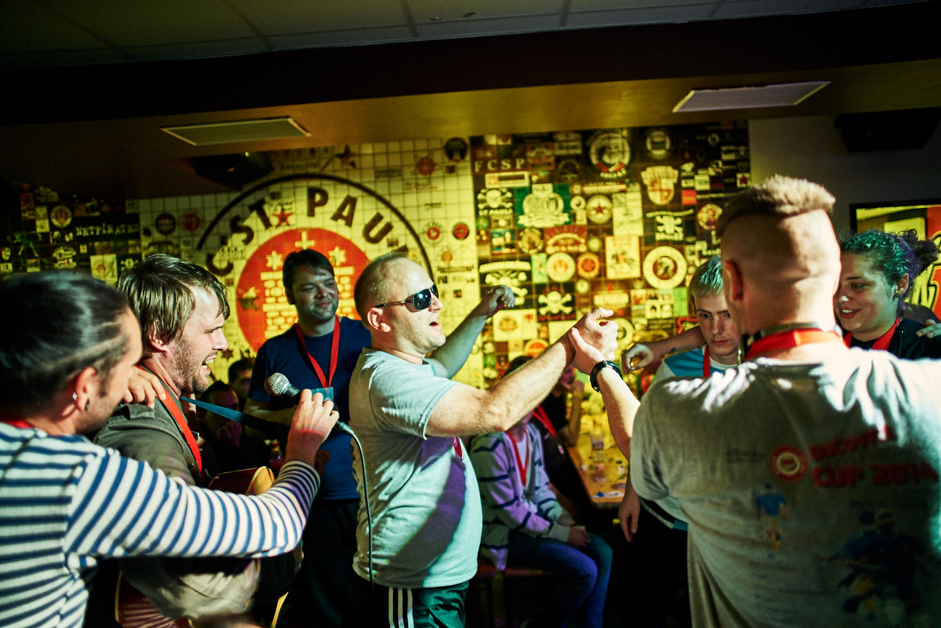 Anschließend wurde in den Fanräumen noch gemeinsam das Hallenmasters gefeiert. Natürlich gab es Pokale, leckeres Essen, tolle Gesangseinlagen, leckeres Bier und tschechischen Schnaps. O-Ton vom Blindenfussballer aus den Reihen vom FC St. Pauli: „Das Zeug trinke ich nicht, da wirst du nur blind von.“