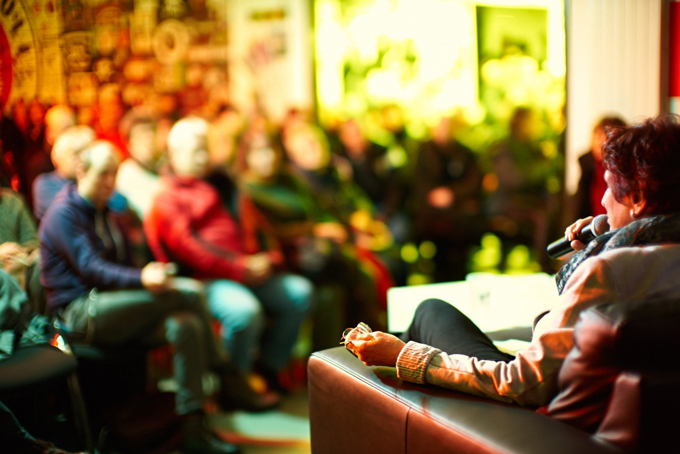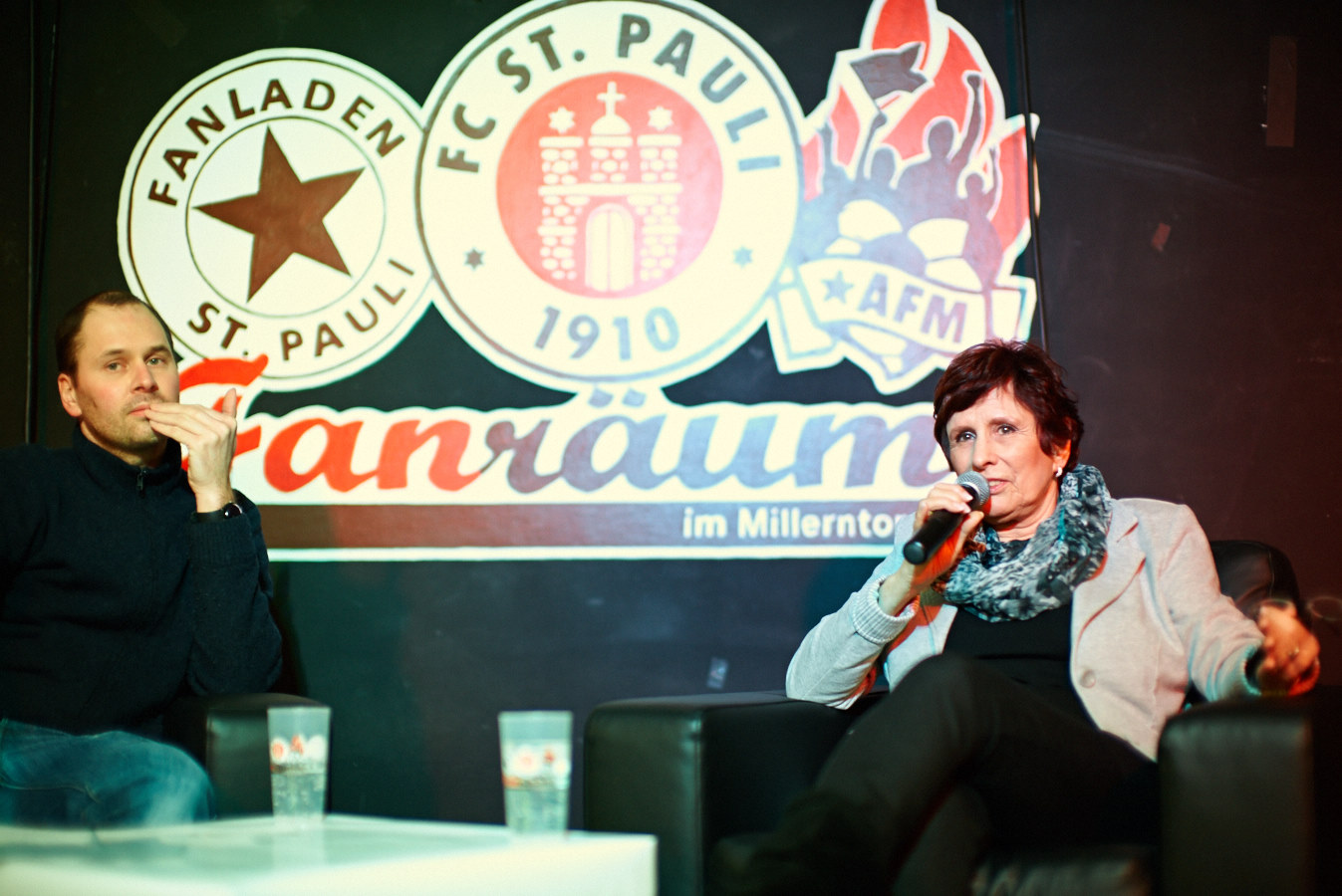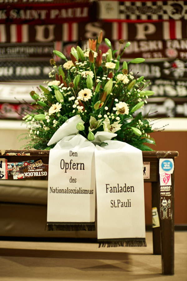 Montag Abend gab es eine dem Anlass entsprechend sehr schöne, vom Fanladen St. Pauli organisierte Veranstaltung zum Gedenken an die Verbrechen im Holocaust. Nach Kranzniederlegung und Schweigeminute vor dem Stadion, folgte eine interessante und bewegende Diskussion mit Norma van der Walde – Tochter des jüdischen Widerstandskämpfers Kurt van der Walde – in den hervorragend besuchten Fanräumen.