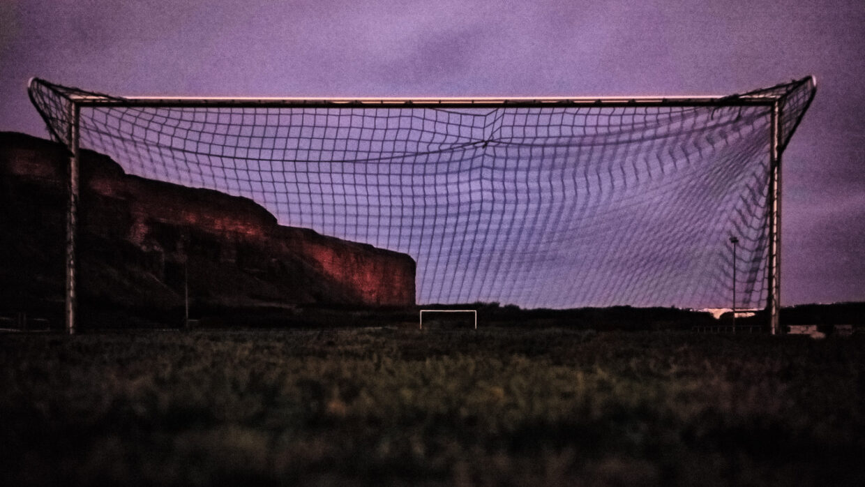 Mir fallen die Linien auf. Tor in Tor, die weiche Kante der Steilküste. Auf der rechten Seite der starre Flutlichtmast und der Wind in den Maschen des Tornetzes. Ein Bild wie ein Gedicht.