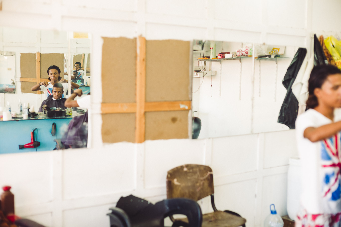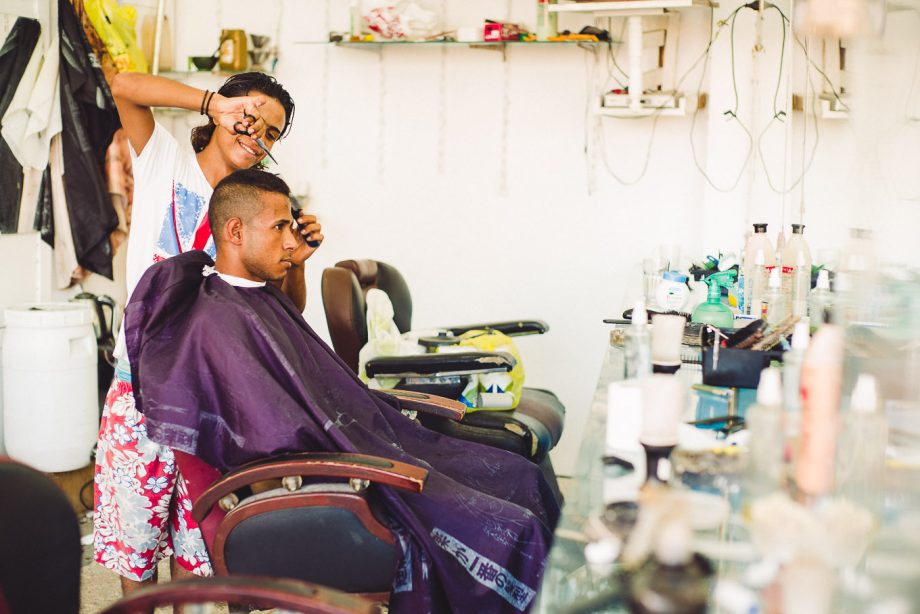 Ursprünglich war ich nur von dem Wäscheständer mitten auf der Strasse fasziniert. Ich wurde allerdings sofort vom Inneren des Frisörladens bemerkt und charmant herangewunken. Es entwickelte sich ein kurzer und freundlicher Austausch mit Händen und Englisch. Es war überhaupt kein Problem, den Frisör bei der Arbeit fotografisch festzuhalten.