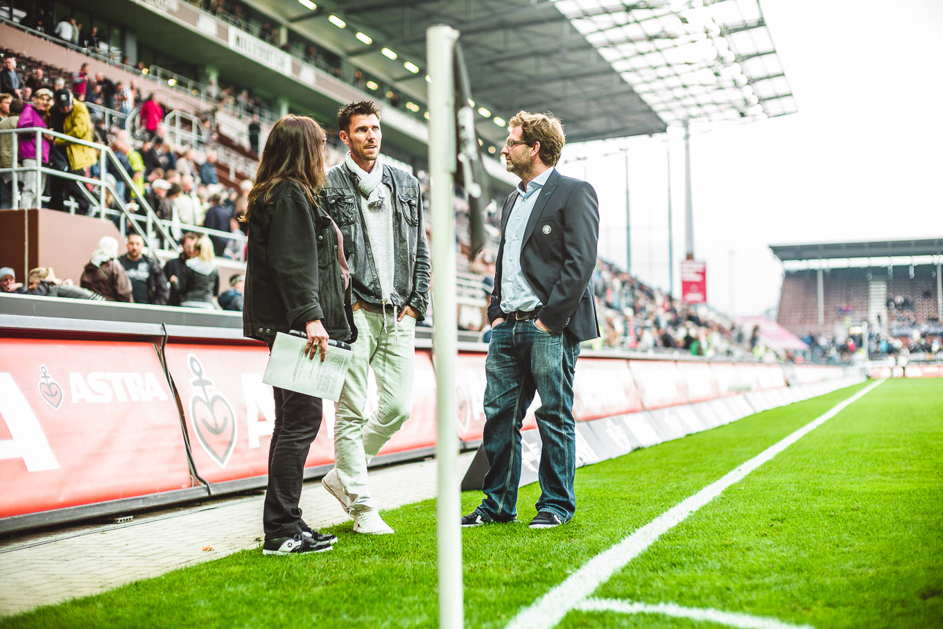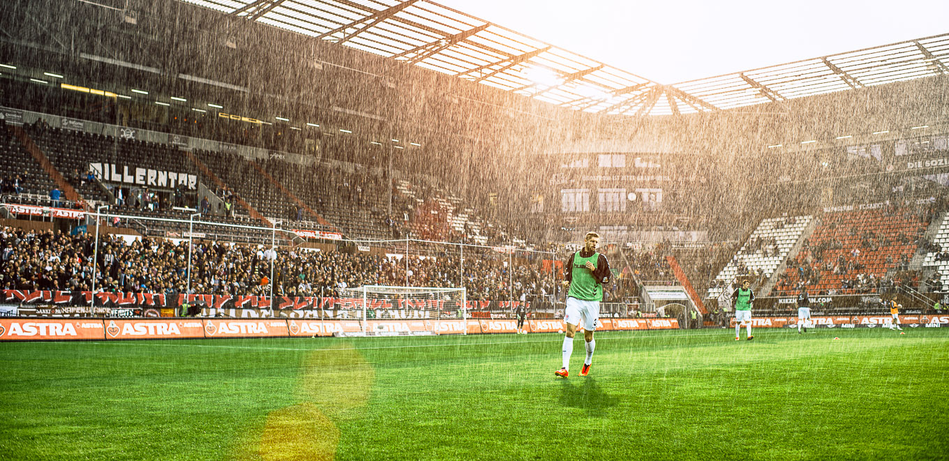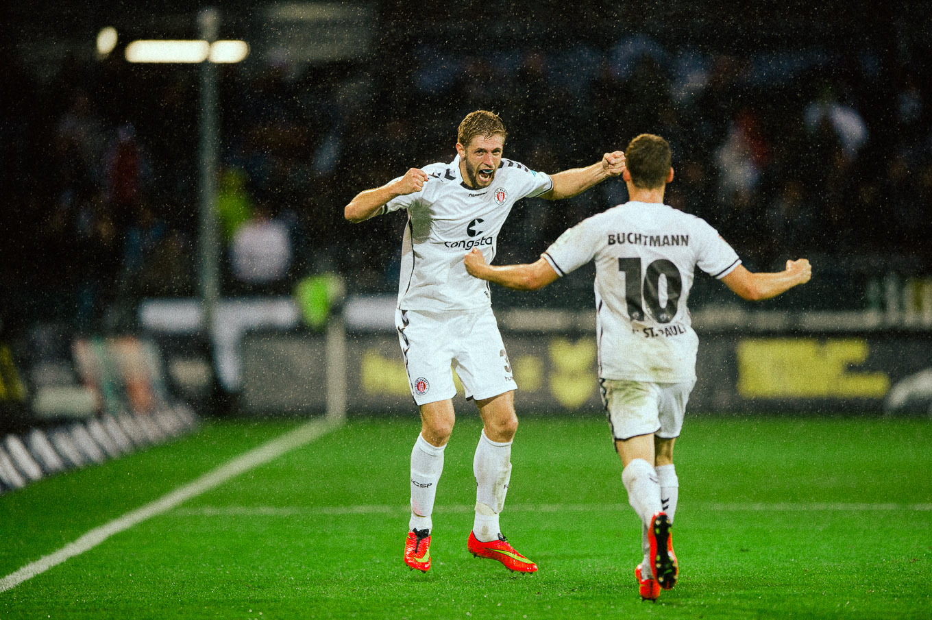 Regen ist beim Versuch sportliche Aktivitäten festzuhalten immer hinderlich, denn auf Bildern sind eigentlich Belichtungszeiten von bis 1/125 Sekunde notwendig – sonst ist der Regen nicht als Regen wahrzunehmen. Fussballaktionen benötigen aber mindestens 1/1000s, um nicht unscharf zu werden. Daher konnte ich nur die Aufwärmphase für ein schönes Regenbild nutzen. Zufall, dass mir da schon Lasse Sobiech piktoresk ins Bild läuft. Am Ende des Spiels sorgte der einsetzende Regen nur, dass sich mein Macbook Pro nass regnete. Ich konnte mein Trackpad nicht mehr nutzen, da es unter Wasser stand. Dabei hatte ich doch ein ganz gutes Foto vom Torjubel von Lasse Sobiech erkämpft, aber ich wollte es für eine bessere Wirkung noch beschneiden. Ging nicht. Ich habe es so rausgeschickt, weil es am Freitag Abend kurz vor Redaktionsschluss nur auf Schnelligkeit ankommt. Ich war wohl zum einen einer der Schnellsten und zum zweiten einer der Wenigen mit einem Querformat vom Jubel. Hat am Samstag dann das Abendblatt gefüllt 🙂