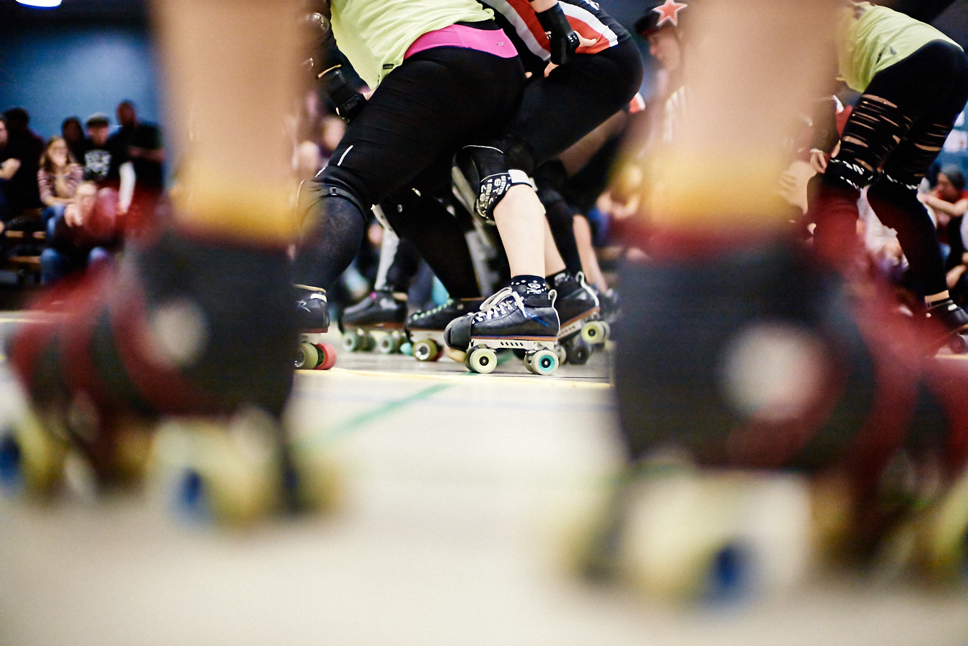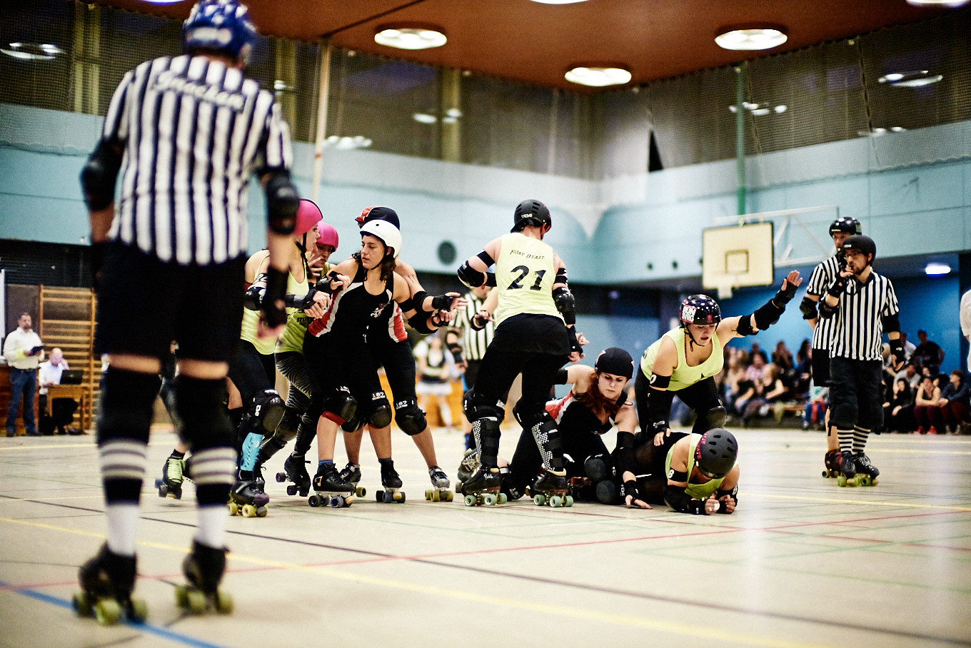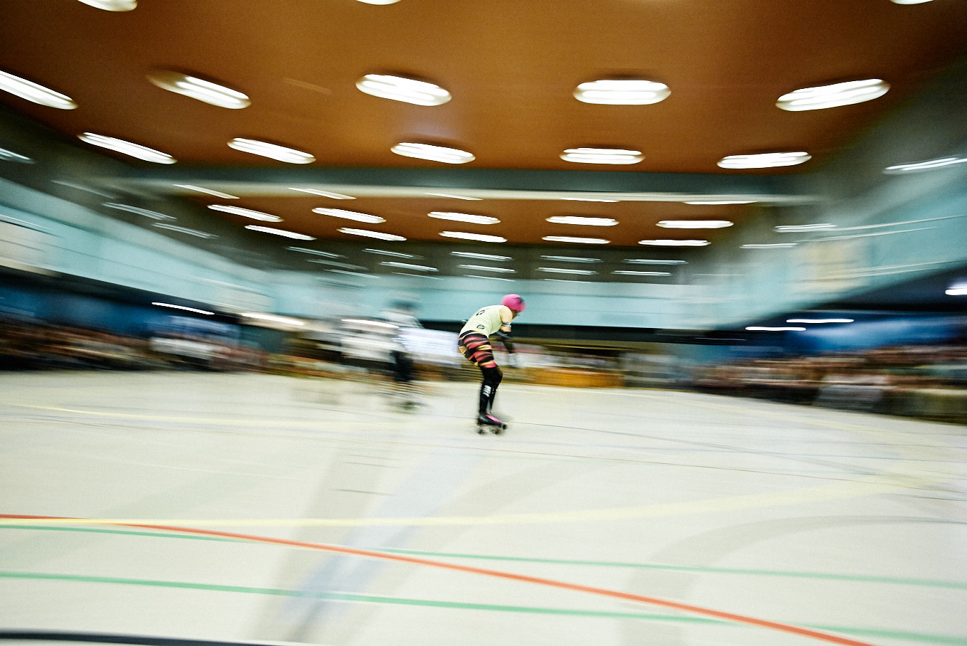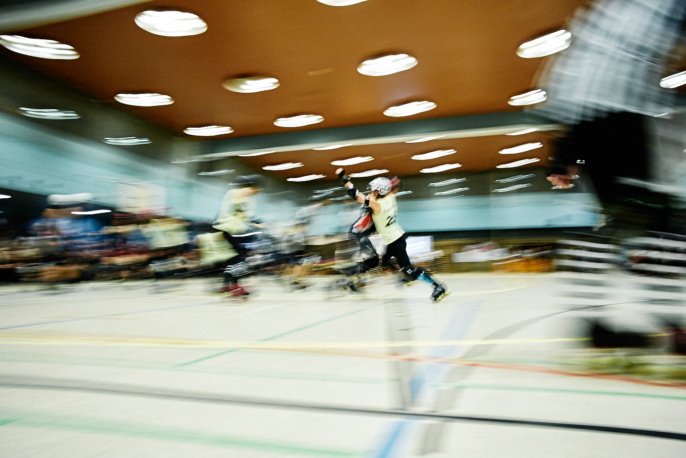 Zwar habe ich hier schon das ein oder andere Mal Bilder vom Roller Derby gezeigt, trotzdem wurde ich neulich von einem interessierten Blogleser (Name der Redaktion bekannt) gefragt, was eigentlich Ziel des Spiels sei: Gegenspielerinnen überholen, als Erste. Da maximal fünf Gegenspielerinnen im Oval mitlaufen, gibt es auch fünf Punkte pro Runde. Naja, zumindest fast. Die Regeln sind etwas komplexer. Sie werden aber während des Spiels von der wunderbaren Stadionsprecherin erläutert. Taktische Finessen erkennt man spätestens nach dem vierten oder fünften Besuch 😉