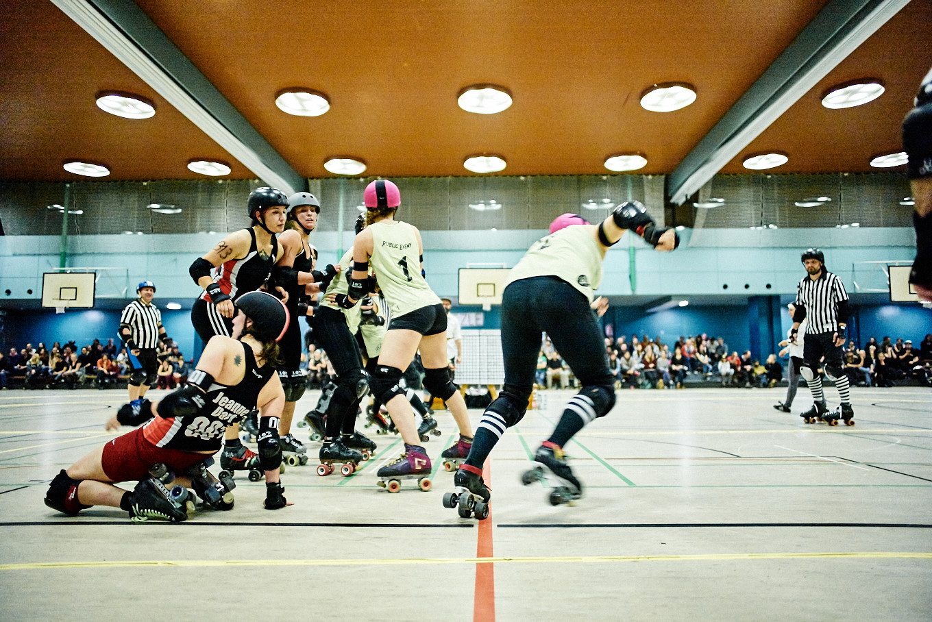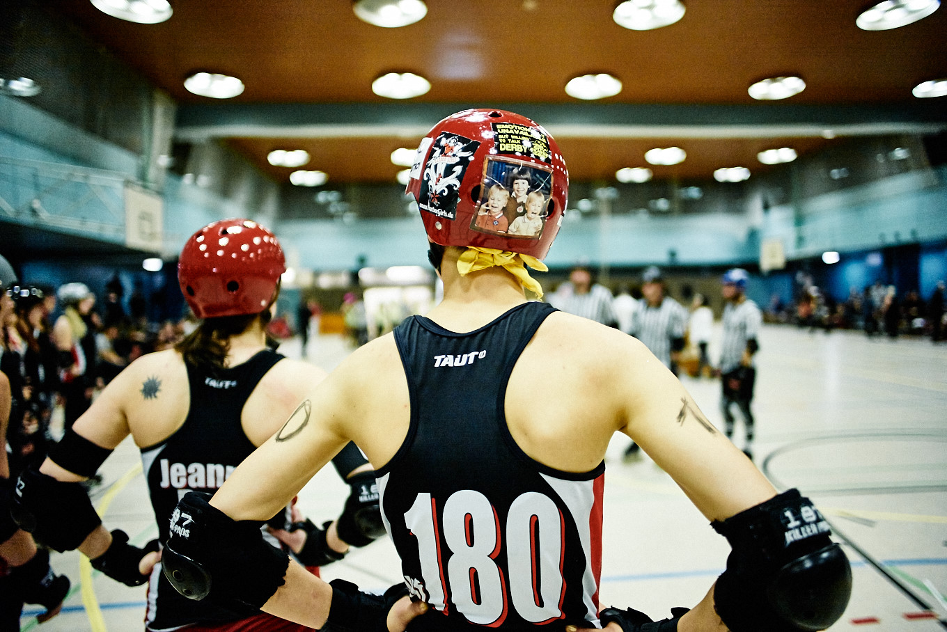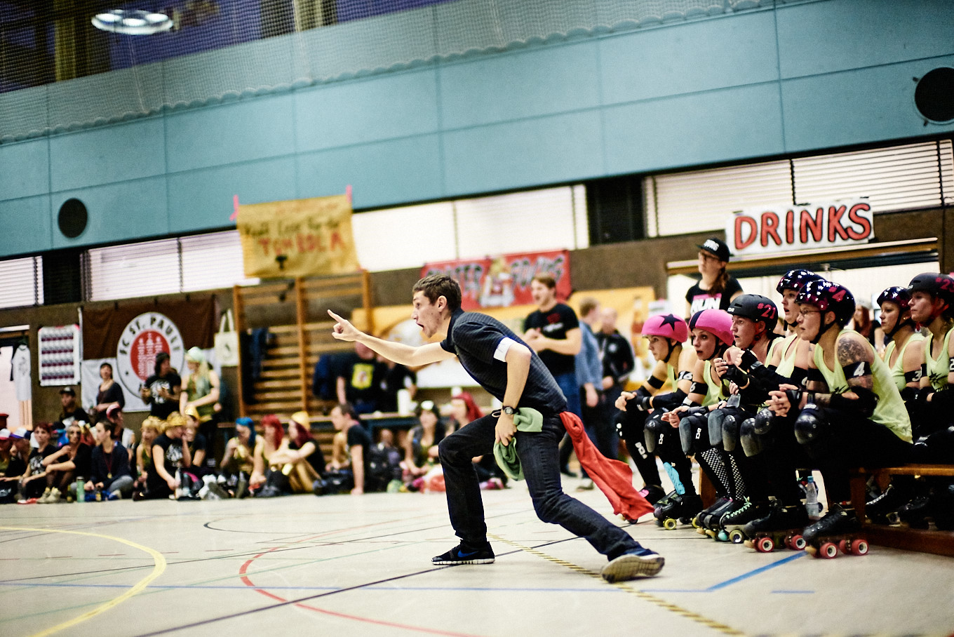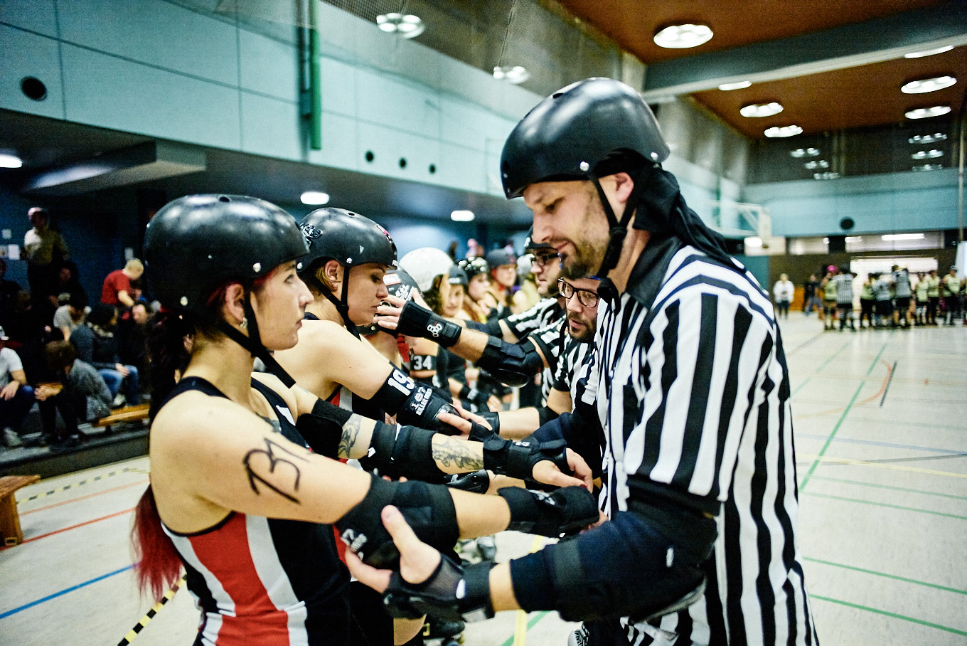Zwar habe ich hier schon das ein oder andere Mal Bilder vom Roller Derby gezeigt, trotzdem wurde ich neulich von einem interessierten Blogleser (Name der Redaktion bekannt) gefragt, was eigentlich Ziel des Spiels sei: Gegenspielerinnen überholen, als Erste. Da maximal fünf Gegenspielerinnen im Oval mitlaufen, gibt es auch fünf Punkte pro Runde. Naja, zumindest fast. Die Regeln sind etwas komplexer. Sie werden aber während des Spiels von der wunderbaren Stadionsprecherin erläutert. Taktische Finessen erkennt man spätestens nach dem vierten oder fünften Besuch 😉