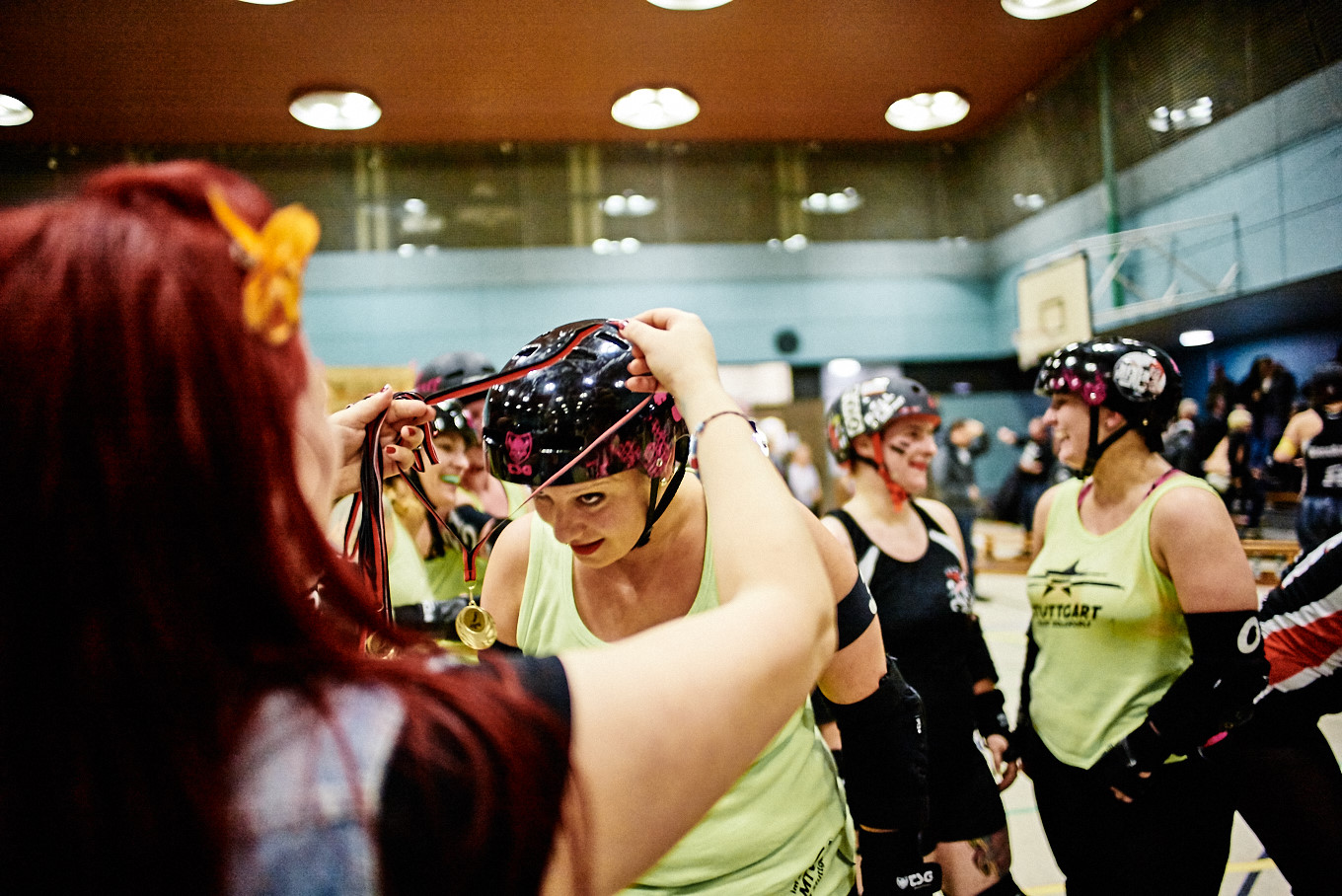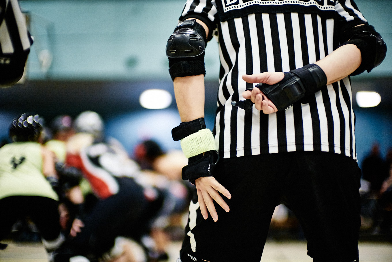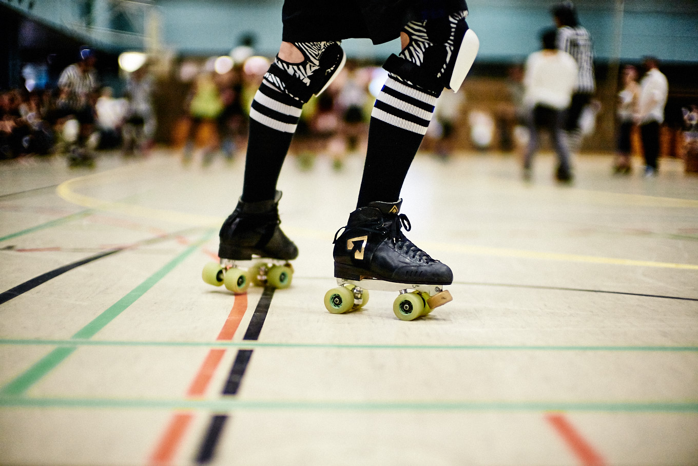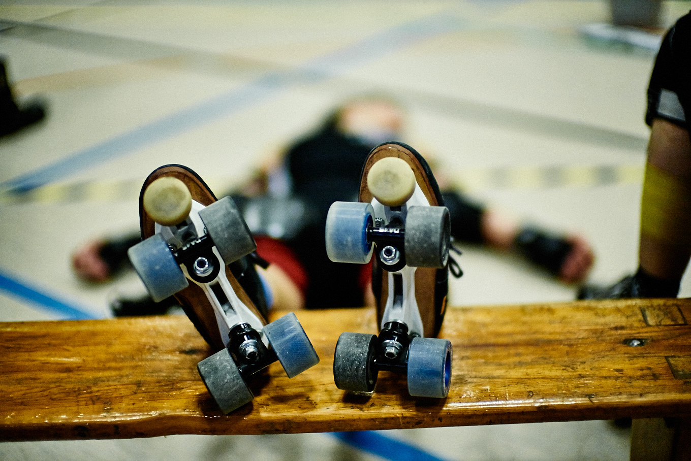 Zwar habe ich hier schon das ein oder andere Mal Bilder vom Roller Derby gezeigt, trotzdem wurde ich neulich von einem interessierten Blogleser (Name der Redaktion bekannt) gefragt, was eigentlich Ziel des Spiels sei: Gegenspielerinnen überholen, als Erste. Da maximal fünf Gegenspielerinnen im Oval mitlaufen, gibt es auch fünf Punkte pro Runde. Naja, zumindest fast. Die Regeln sind etwas komplexer. Sie werden aber während des Spiels von der wunderbaren Stadionsprecherin erläutert. Taktische Finessen erkennt man spätestens nach dem vierten oder fünften Besuch 😉
