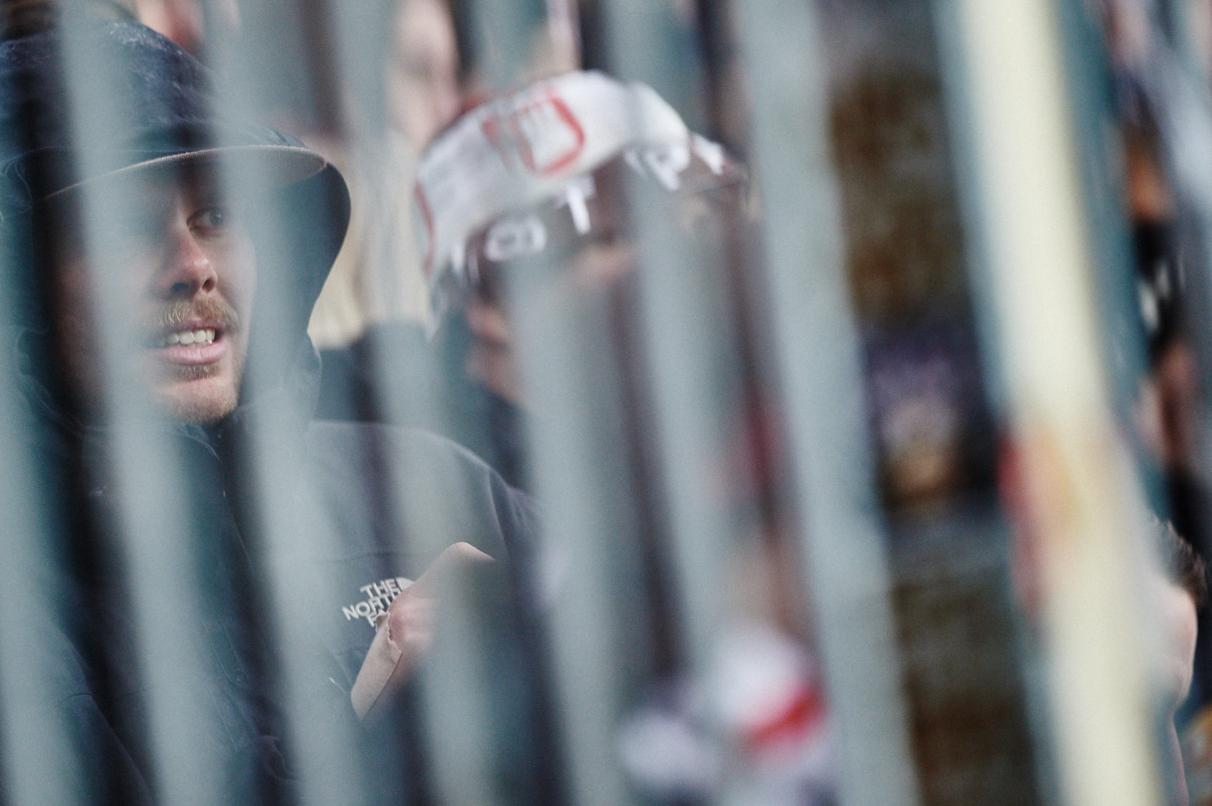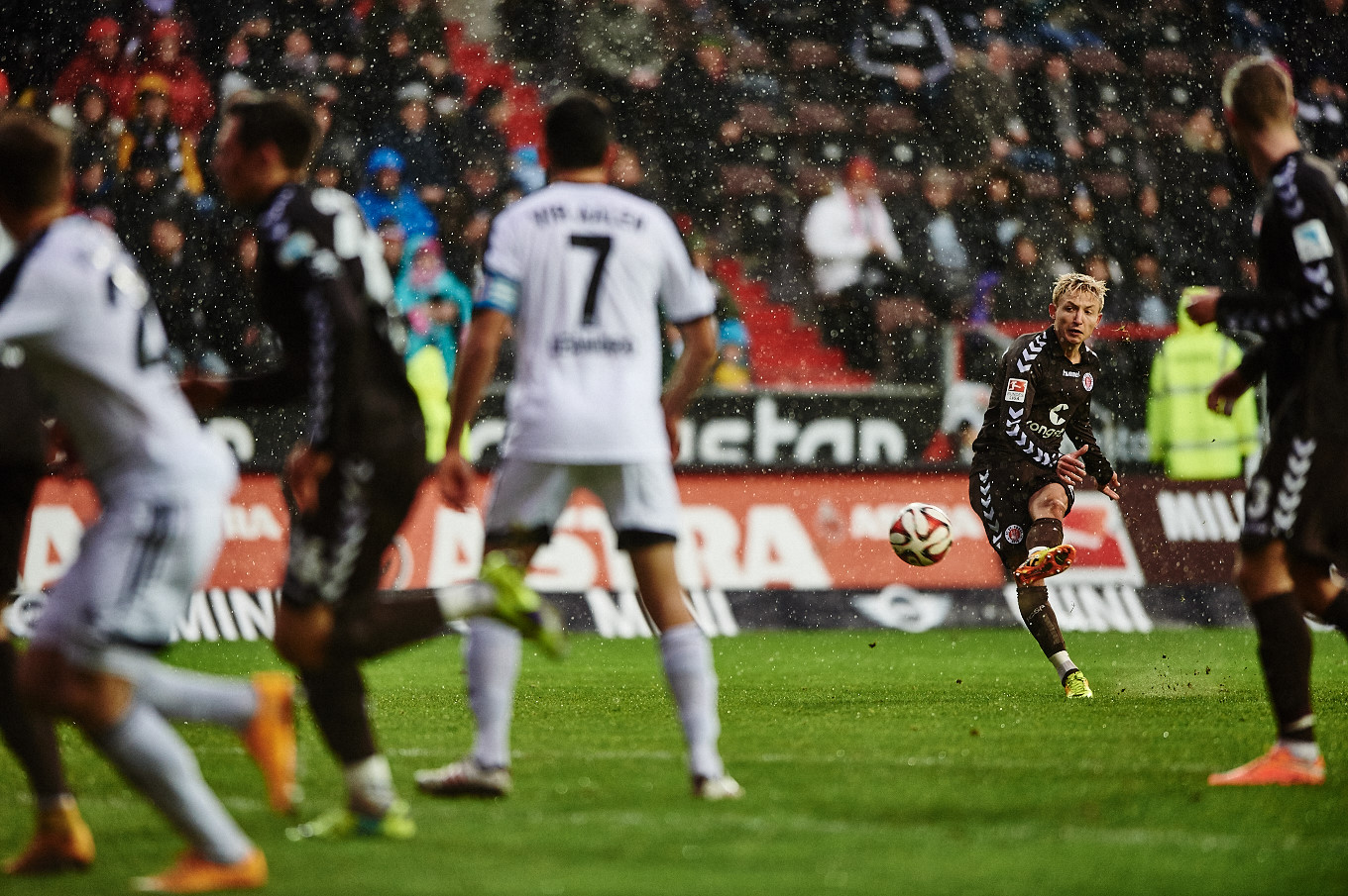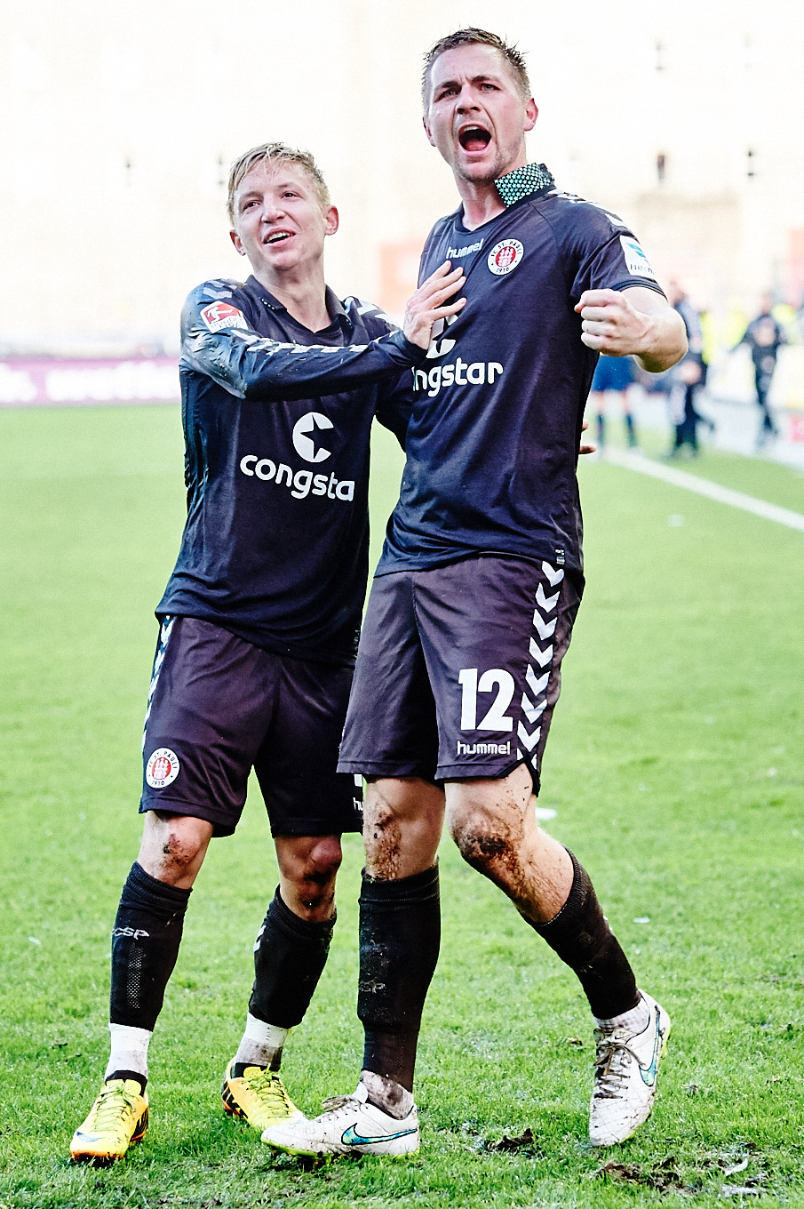 In der zweiten Halbzeit ließ sich der Wind vom Sturmlauf der Sankt Paulianer anstecken. In der Entstehung des 3:0 schob eine heftige Windböe die beiden Werbebanden, in deren Nahtstelle ich bis zu diesem Zeitpunkt saß, mit spielerischer Leichtigkeit nach hinten. Sie rutschten den Hügel herunter, der seit Jahren das Spielfeld vor der Nordtribüne umgibt und drückten mich beim Fotografieren des 3:0-Treffers erst in den Absperrzaun und dann in die Fundamente der neuen Nordtribüne. Als das Millerntor das dritte Tor bejubelte, lag ich plötzlich im eiskalten knietiefen dreckigen Wasser. Die hilfsbereiten Ordner, die sofort angerannt kamen, zogen dann nicht nur mich, sondern auch meine Nikon D3 inklusive 70-200mm-Objektiv aus dem Wasser. Aus eigener Kraft wäre ich aus dem Loch wohl nicht mehr herausgekommen.