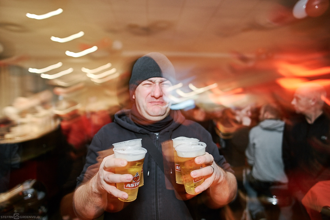 Meinen Plan, den als eher kamerascheu bekannten Fans mit der kleinen Leica unauffällig zu begegnen, scheiterte an den grausligen Lichtverhältnissen im Ballsaal der Südtribüne. Ich sattelte auf die kleine Kamera einen im Verhältnis überdimensionalen Nikon Blitz und hatte natürlich keine Chance, moderne Erleichterungen aktueller Kameratechniken zu nutzen. Statt simplen TTL-Blitzen war Mitdenken und der manuellen Modus auch beim Blitz angesagt. Das brachte mich des öfteren ins Schwitzen, aber überwiegend hat es ganz gut funktioniert.